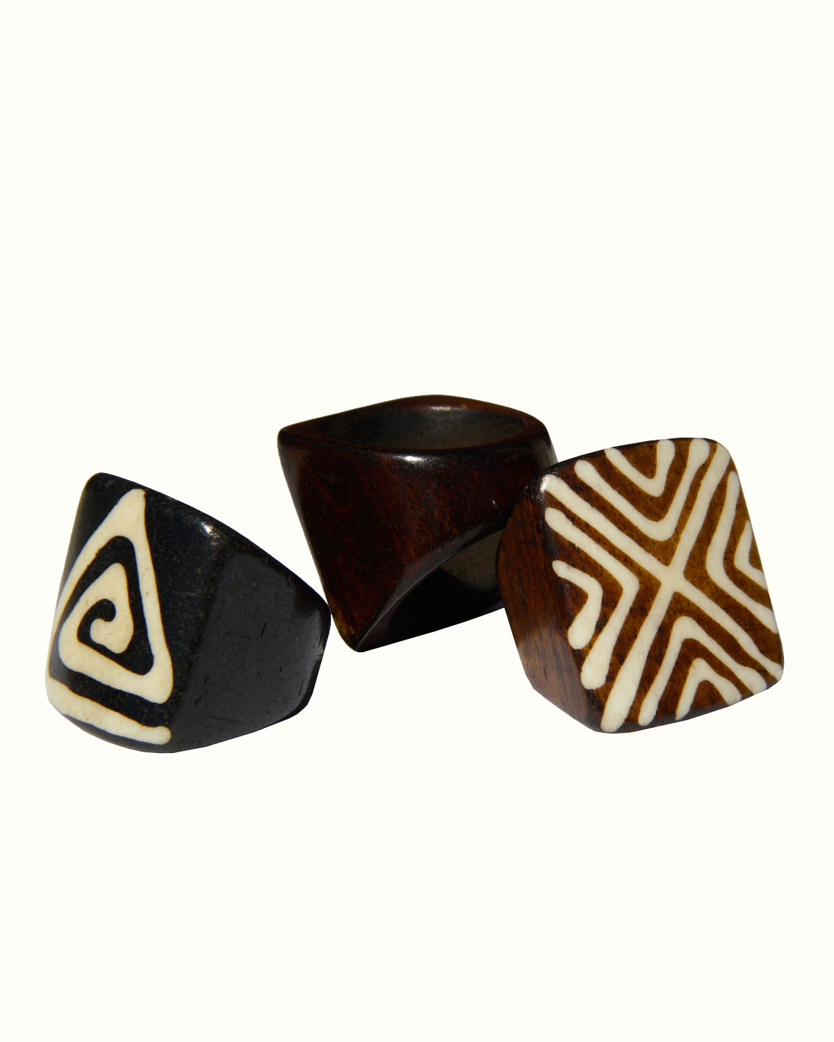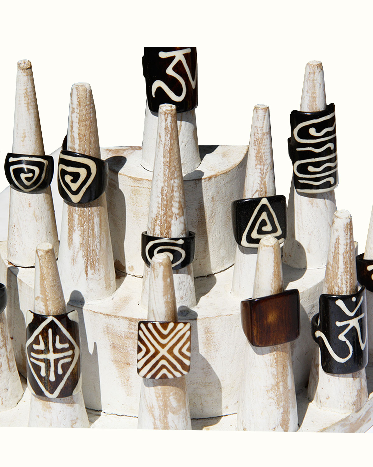 Deliziosi ed etnici anelli, realizzati in osso da artigiani indiani, con decorazioni in colore differente. Disponibili nei modelli rettangolare lungo, quadrato e a fede bombata con motivi tribali o in tinta unita e in misure assortite. Disponibili color marrone scuro, marrone medio e motivi color panna. Confezioni da 4 pezzi. ( prezzo unitario )