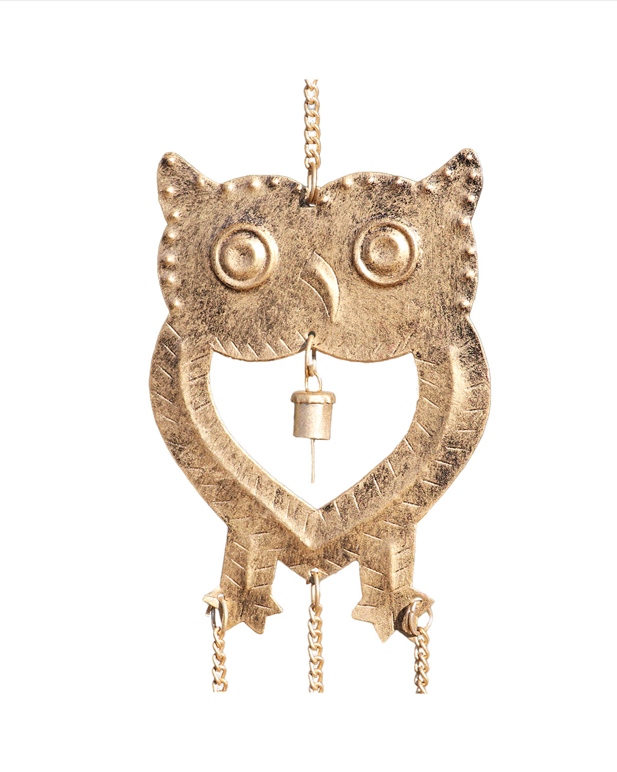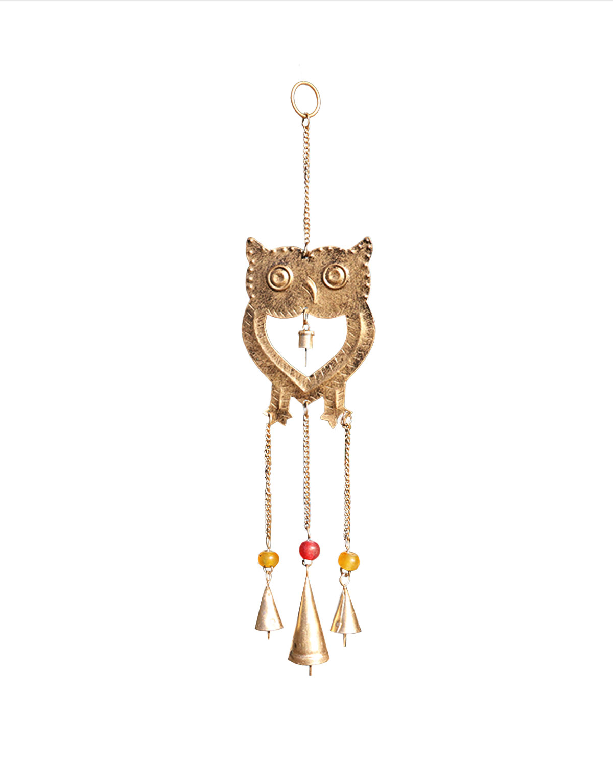 Graziosissime campane del vento, realizzate da artigiani indiani in metallo dorato antichizzato molto leggero, da appendere in casa o sotto un portico. Originali campane con civetta e 4 campanelle sonore che suonano col vento o il movimento. Disponibili color oro antico o rame con perline colorate. Misure: lunghezza totale cm 45, civetta cm 15 x 11,5, campanella grande cm 8 x diametro cm 3, medie cm 4,5 x diametro 2,2, piccola cm 2,2 x diametro mm 7.