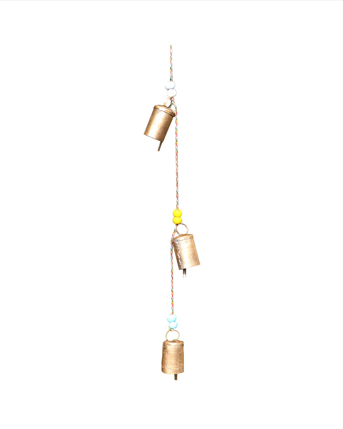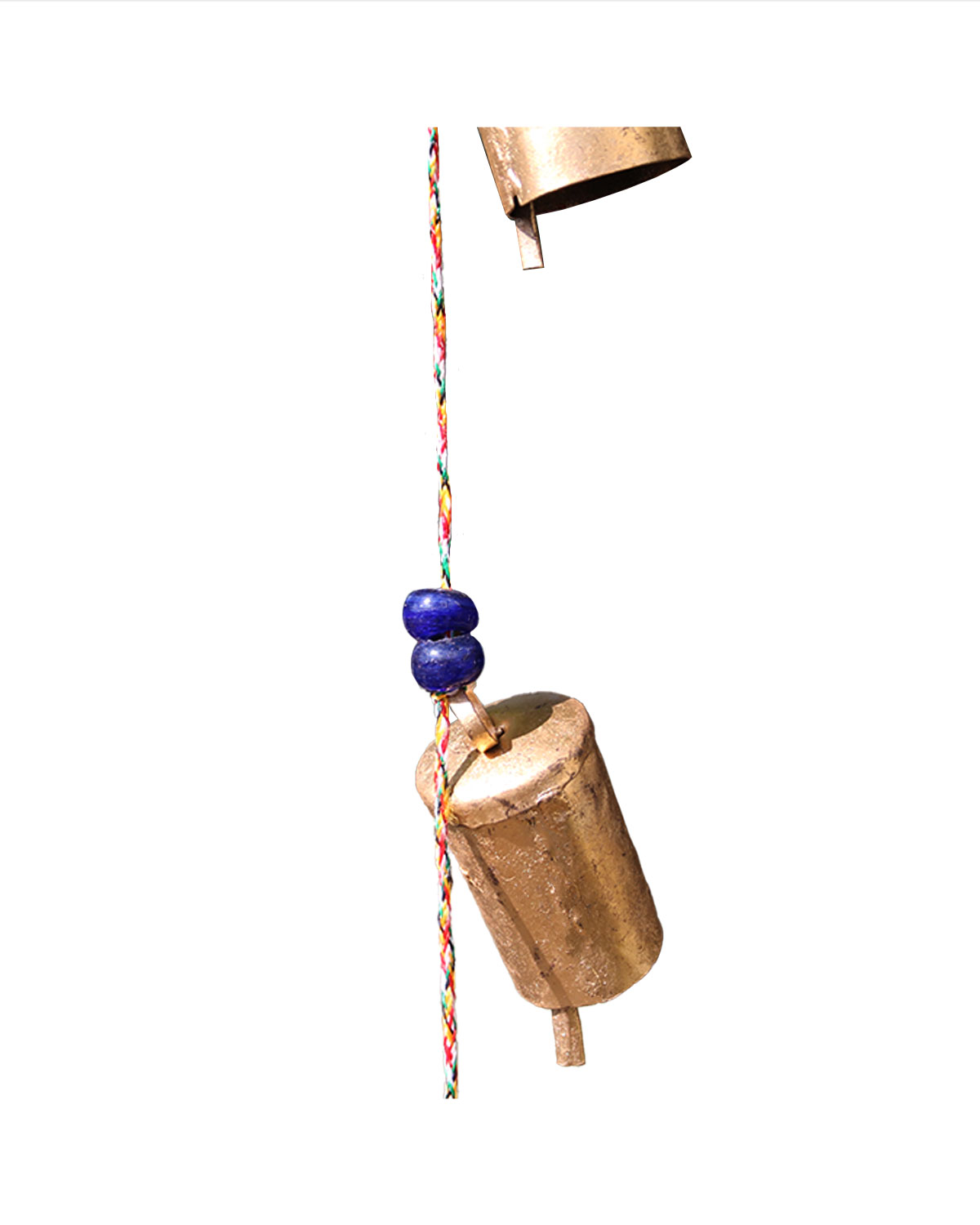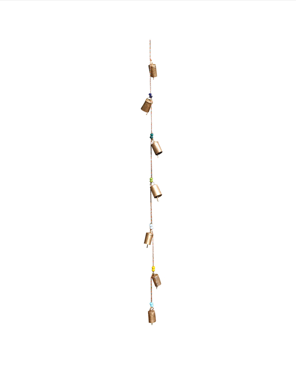 Graziose campane del vento realizzate da artigiani indiani in rame con tecniche artigianali e tradizionali. Dal suono deciso e profondo si rivelano adatte da appendere sia all’ interno, possibilmente in prossimita’ di porte e finestre che all’ esterno, meglio sotto un portico. Sonagli che suonano con il vento o il movimento composti da una fila di 7 campanelle di forma cilindrica unite tra loro con fili intrecciati , decorati con perline di vetro colorate. Disponibili color oro antichizzato. Misure: lunghezza cm 145 x 7 campanelle di cm 4 x 3 x h 8 con battacchio e anellino d’aggancio.