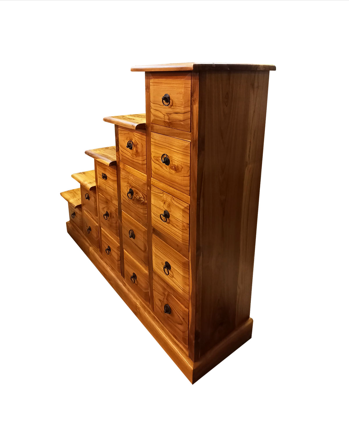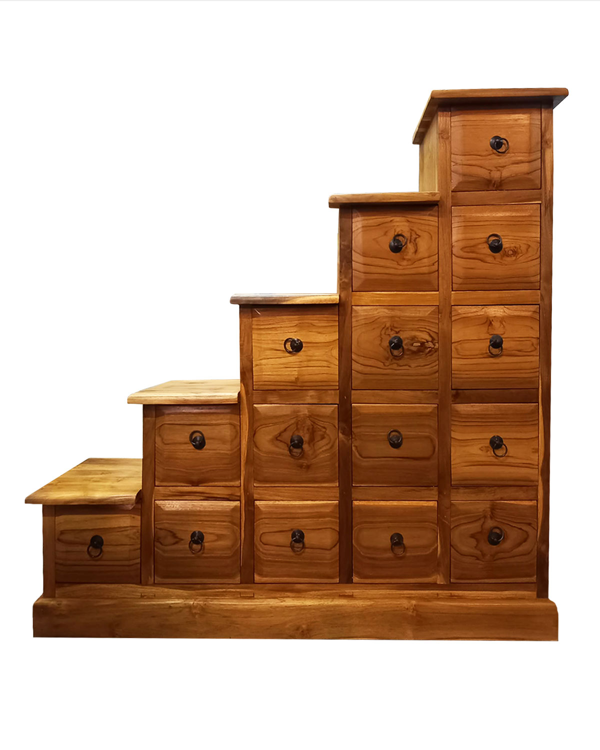 Particolare cassettiera a scaletta realizzata da falegnami indonesiani in legno di teak massello, con tecniche artigianali. Dotata di 15 cassetti disposti su tre livelli con manigliette ad anello in metallo nero antichizzato. Bella per arredare la sala, la camera , un ufficio o anche un ingresso e per riporvi tanti tipi di oggetti tenendoli ordinati e separati . Disponibile color teak chiaro. Misure: larghezza cm 108, profondità cm 30, altezza cm 108, larghezza gradini cm 28 e profondità cm 30, chilogrammi 37 circa..