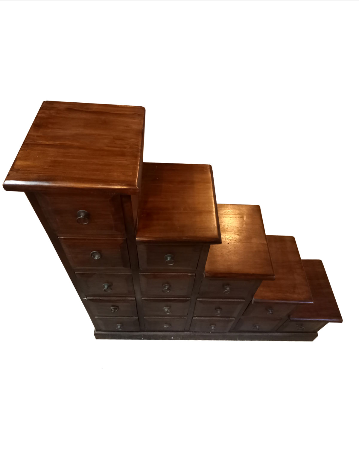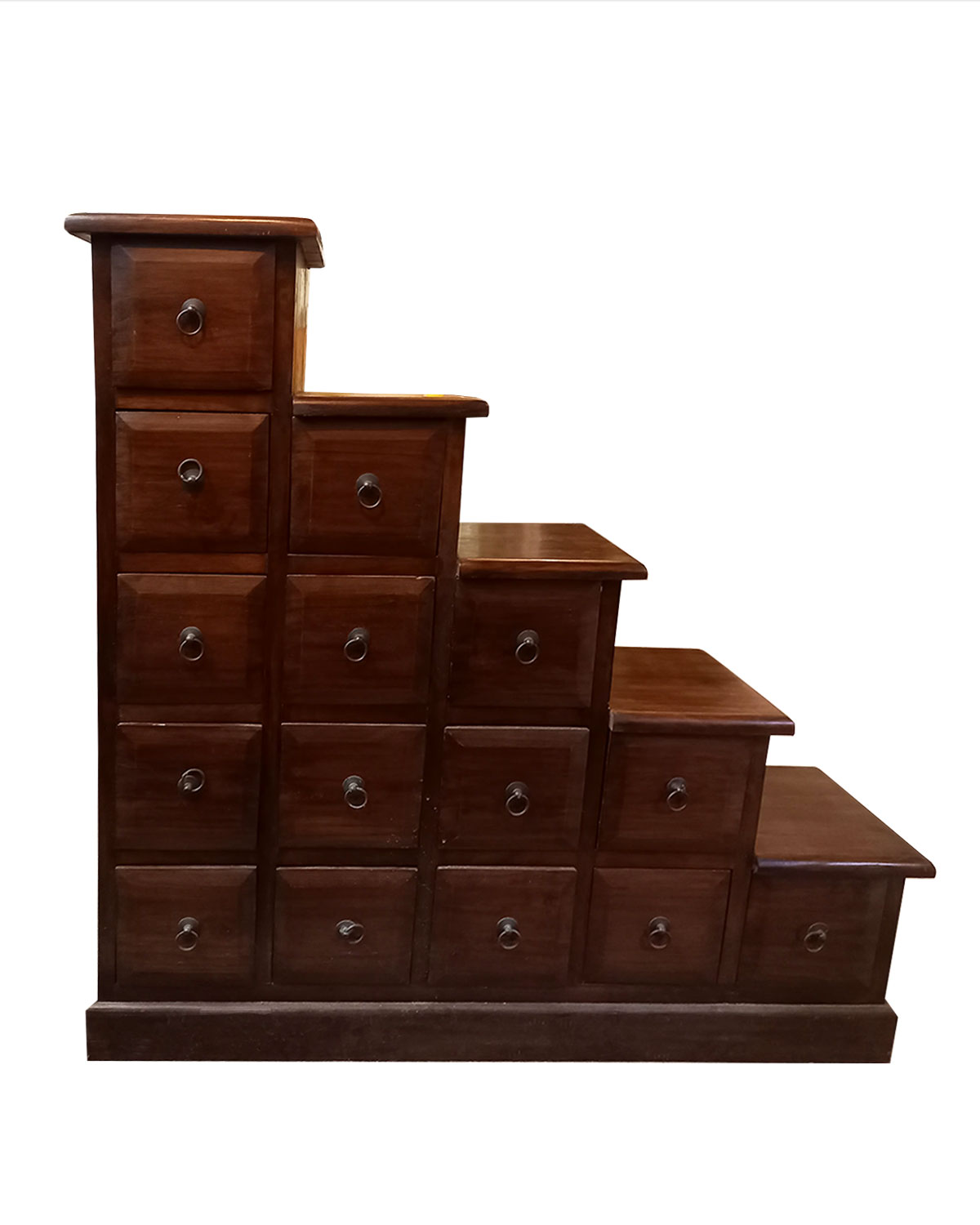 Particolare cassettiera a scaletta realizzata da falegnami indonesiani in legno di teak massello, con tecniche artigianali. Dotata di 15 cassetti disposti su tre livelli con manigliette ad anello in metallo nero antichizzato. Bella per arredare la sala, la camera , un ufficio o anche un ingresso e per riporvi tanti tipi di oggetti tenendoli ordinati e separati . Disponibile color noce scuro. Misure: larghezza cm 108, profondità cm 30, altezza cm 108, larghezza gradini cm 28 e profondità cm 30, chilogrammi 37 circa..