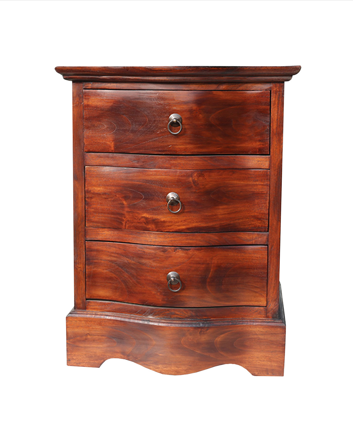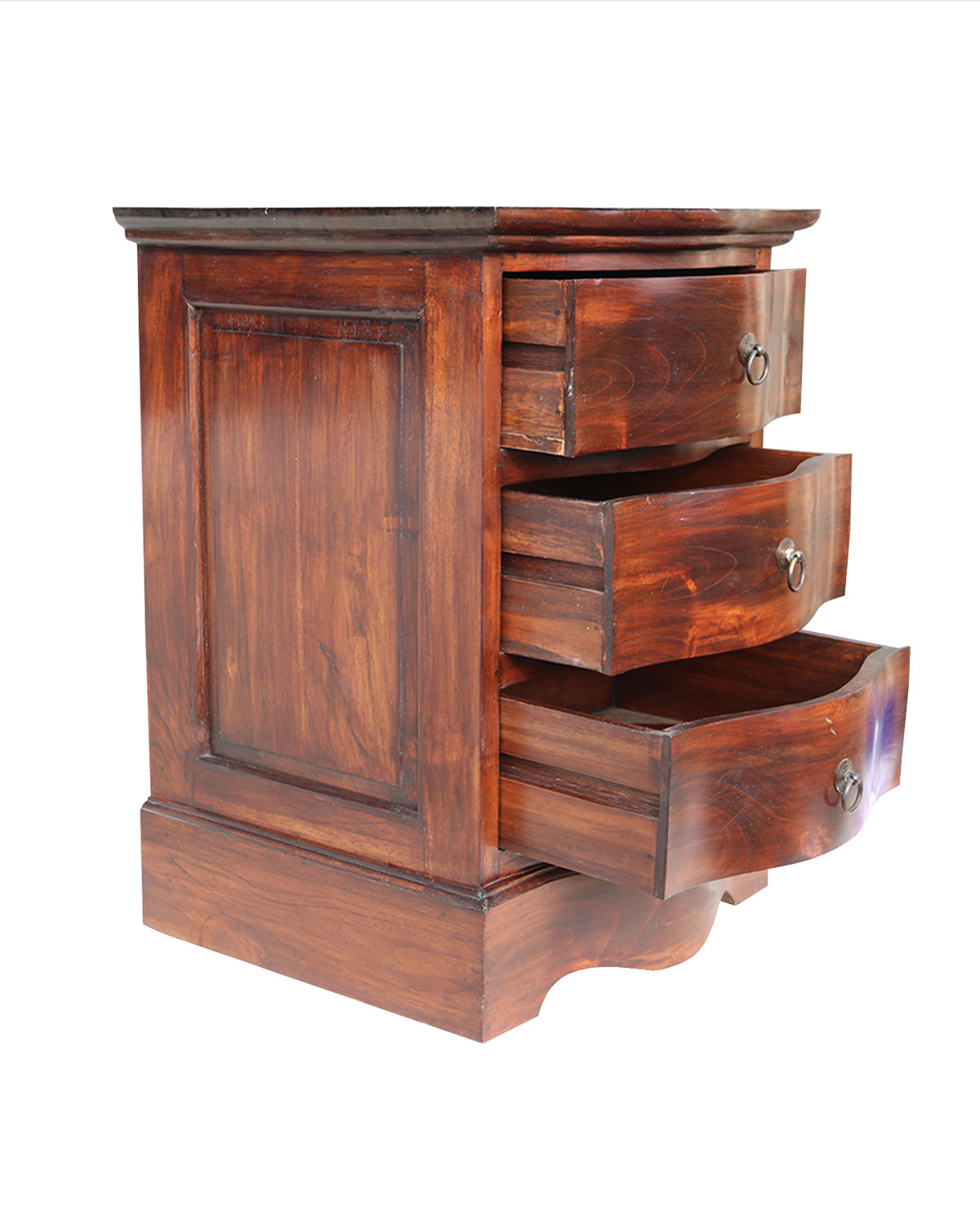 realizzato interamente a mano in pregiato legno di teak, spazioso comodino con 3 cassetti ondulati, adatto da camera, ma anche da ingresso e sala, disponibile in color teak naturale o noce scuro.Misure: lunghezza cm 47, profondità 44, altezza cm 64 circa.