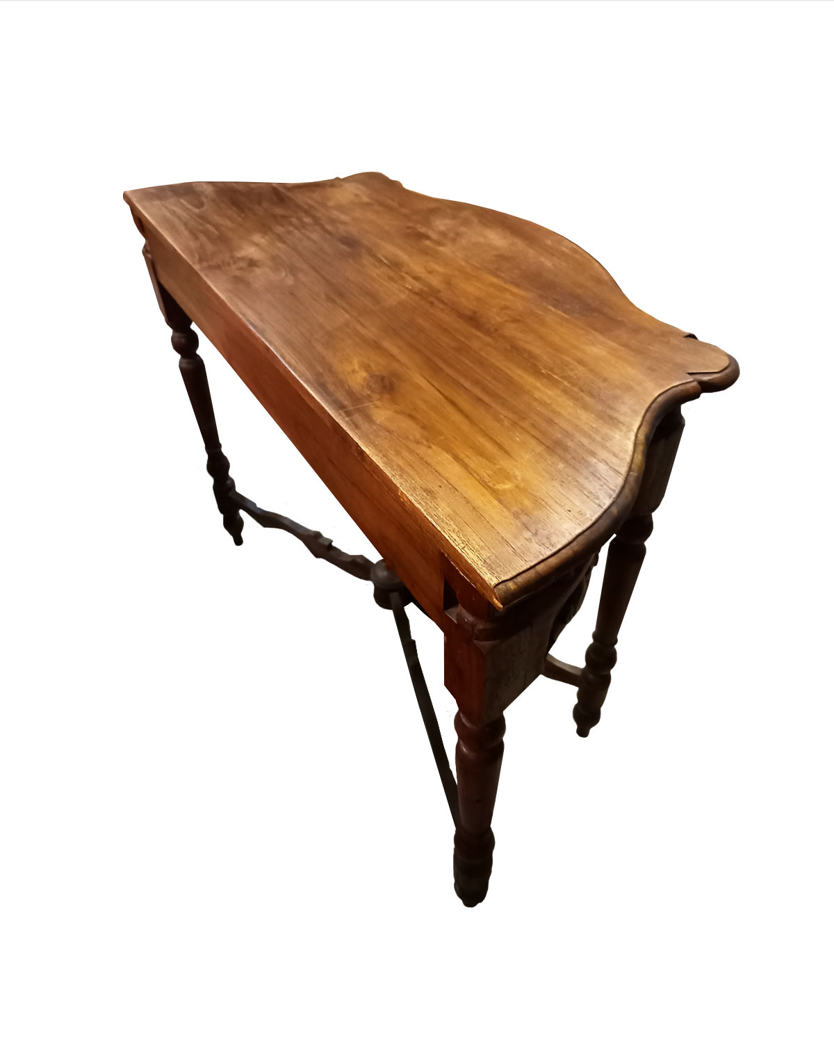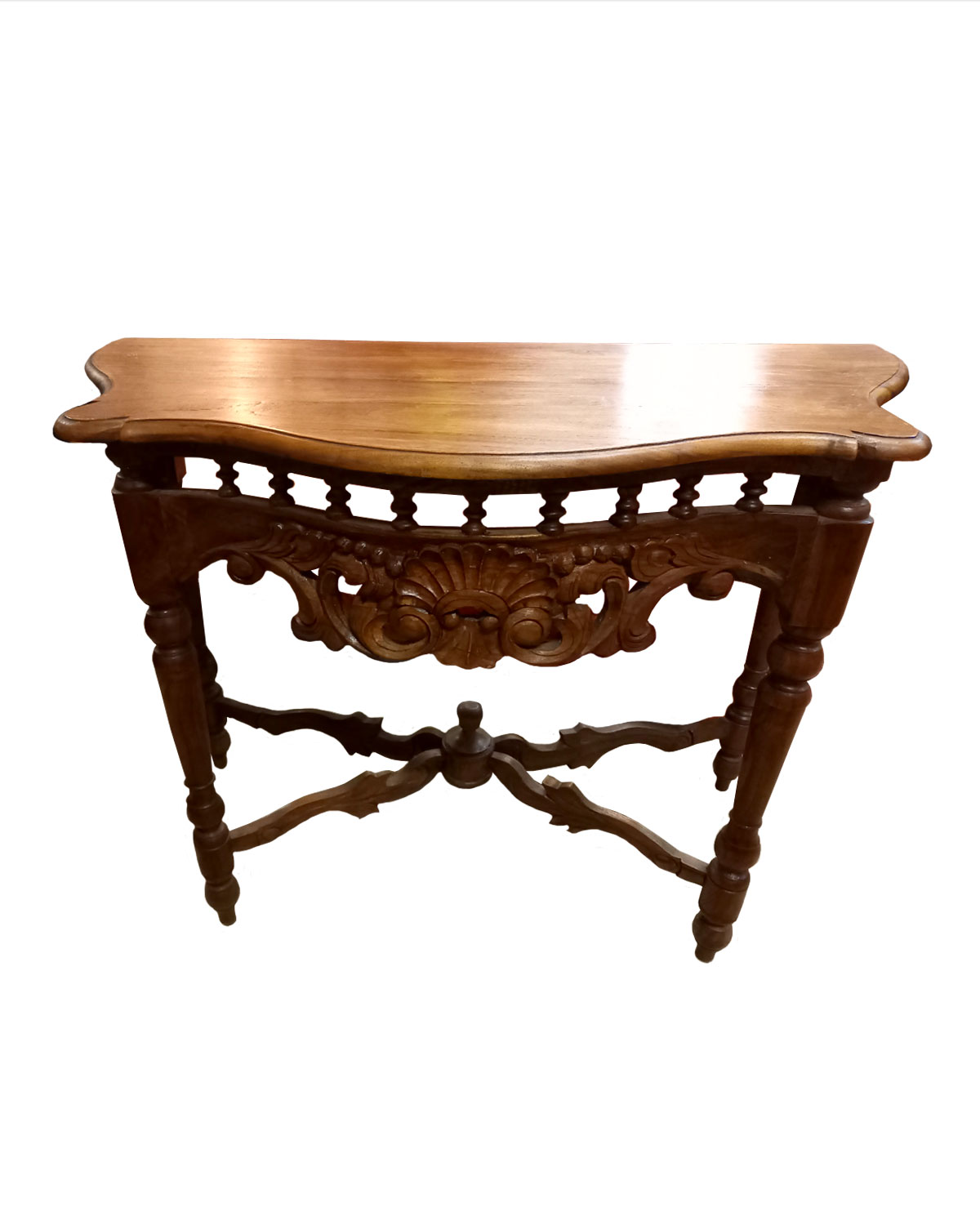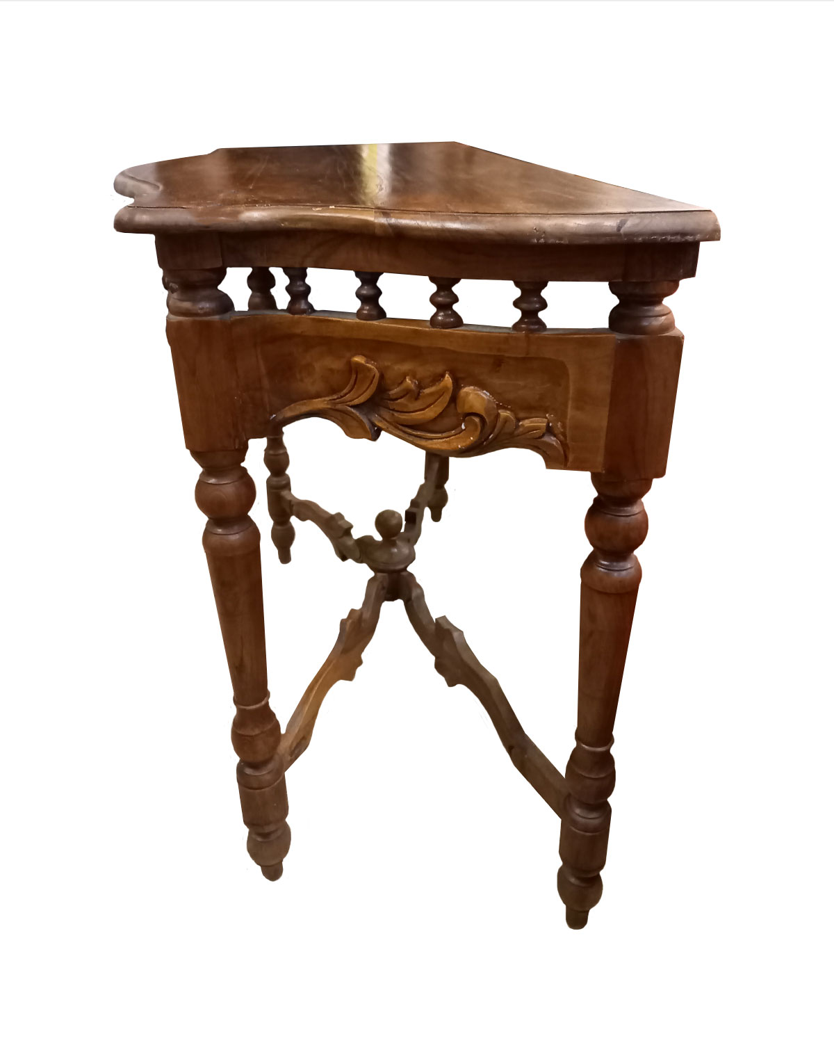 Raffinata e ricca consolle realizzata da falegnami indonesiani in legno di teak massello con tecniche artigianali. Bellissima e importante è costituita da un piano robusto sagomato, intagli e ricchi intarsi sul fronte, gambe sagomate in stile e piano basso decorato che le dona un aspetto ricco e importante. Belle per arredare ingressi, angoli della sala, ma anche camere , uffici e sale d’aspetto in stile. Disponibili color teak naturale chiaro. Misure: larghezza cm 96, profondità minima cm 39, profondità massima cm 45, altezza cm 72.