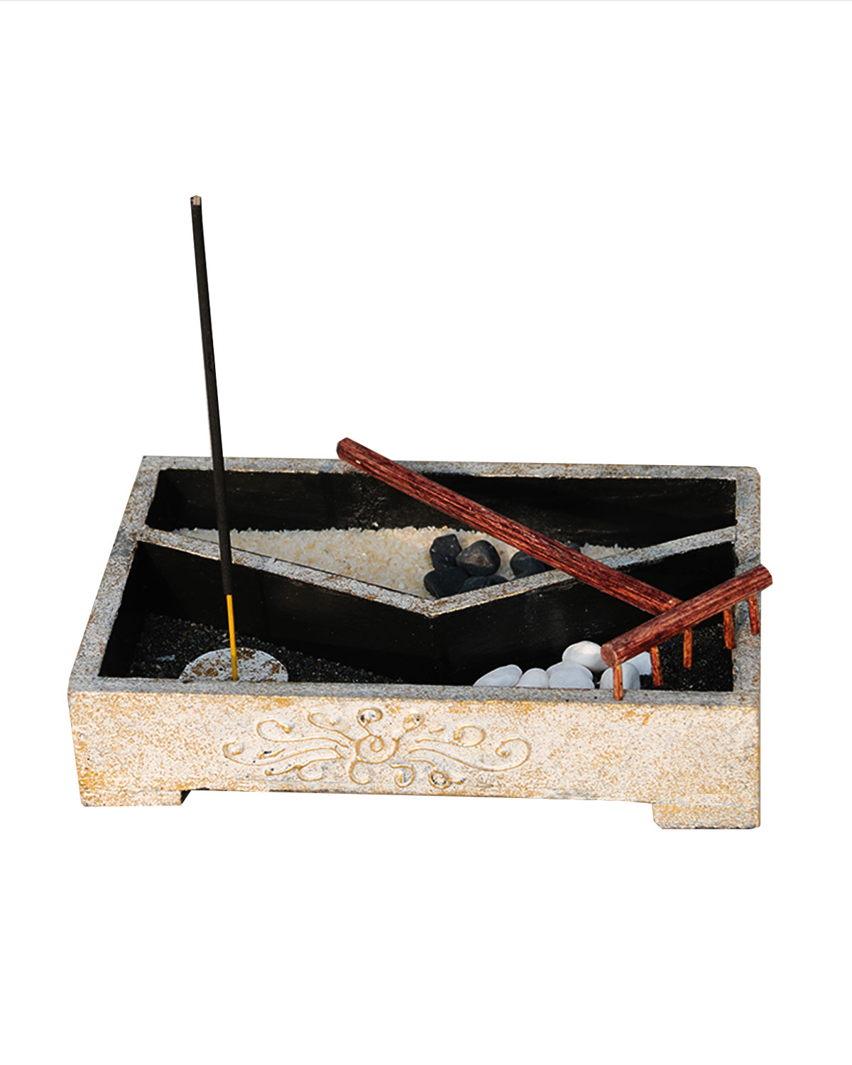 NOTE E SIMBOLOGIA DEI GIARDINI ZEN: I giardini zen, diffusi dai monaci buddhisti, nascono dalla cultura giapponese e vengono realizzati per infondere armonia, pace, indurre allo stato meditativo e ricreare il Ch’i, energia positiva vitale, attraverso elementi naturali densi di profondo significato: la sabbia , rappresenta l’ acqua, simbolo di vita,i sassi rappresentano la solidita’, la pace. Con il rastrello si creano forme ondulate per simboleggiare le onde del mare o altre linee che rappresentano la nostra creativita’ ed interiorita’. Candelina a scopo decorativo ordinabile a parte.