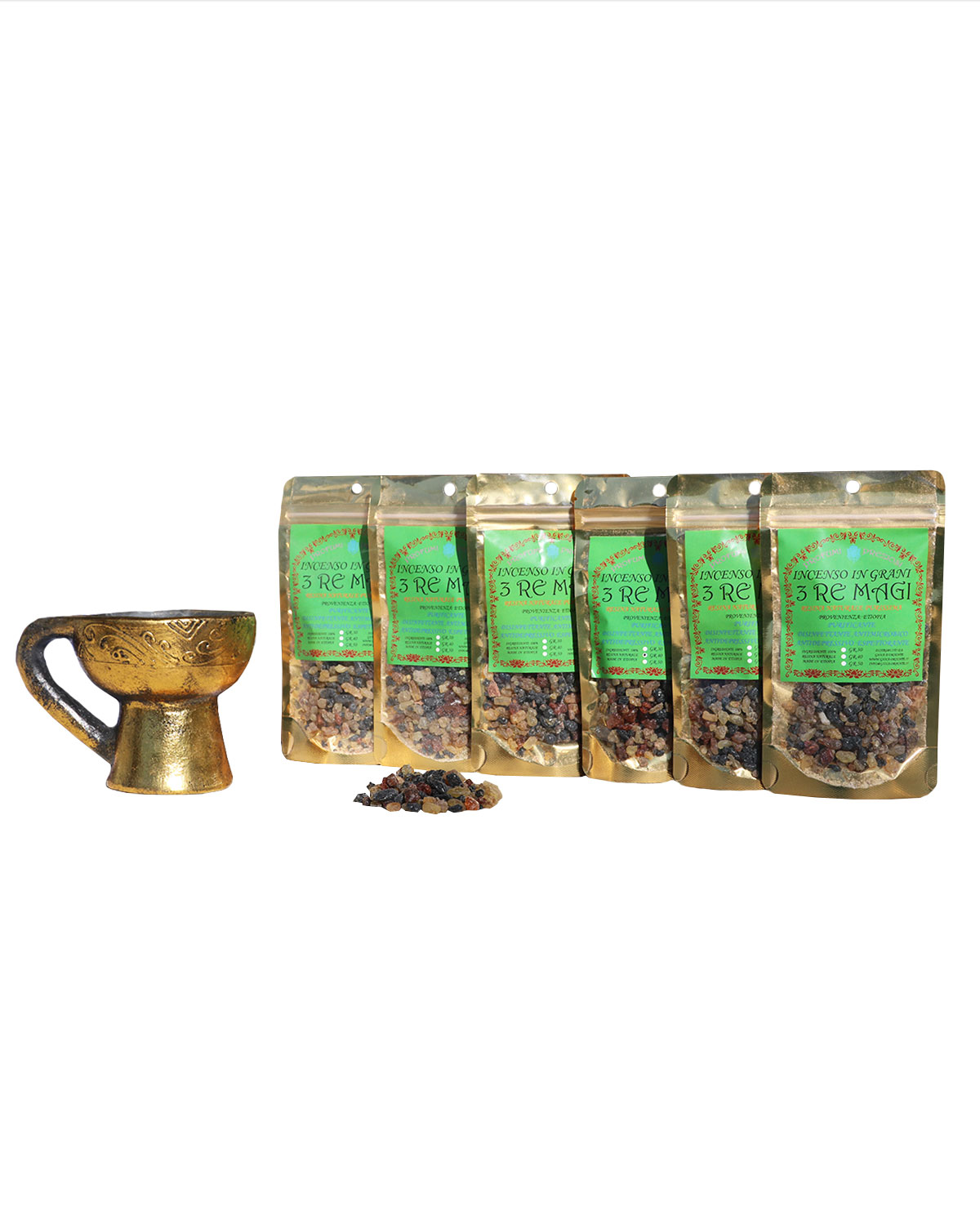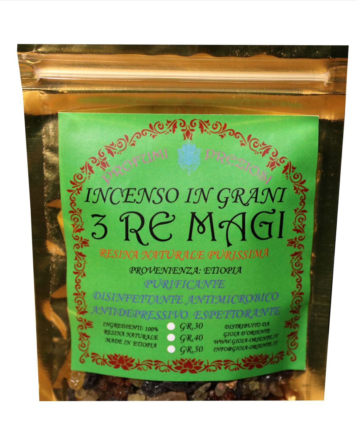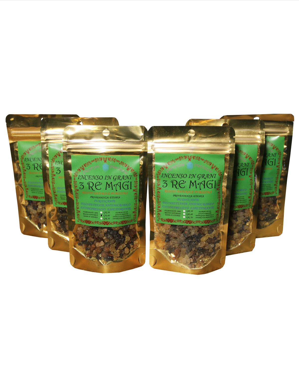 NOTE E STORIA DELL’ INCENSO IN GRANI: Le piante Boswellia crescono ai confini del deserto in una ristretta fascia di terra e sassi chiamata la cintura dell’incenso. La fumigazione dell’incenso, bruciato anche nelle chiese cattoliche, veniva fatta per due scopi principali: per disinfettare gli ambienti e per le proprietà psicoattive. Da sempre si ritiene che questo aroma avvicini l’anima a Dio. Innumerevoli generazioni si sono servite di incenso di Boswellia per la preghiera, il raccoglimento e per entrare in stati meditativi. Si ritiene che l’incenso purifichi gli ambienti interni a noi e ci protegga da ogni influenza negativa e da entità maligne, anche se in sostanza serve soprattutto per concentrare la mente su cose positive. L’incenso agisce sugli stati profondi della psiche, quella parte raffigurata da varie culture come il caos o il maligno. In sostanza aiuta a raggiungere uno stato di equilibrio interiore, sempre suppportato dalla volontà personale. La varietà Guggul, in India, entra tra i rimedi dell’Ayurveda, viene bruciato alla sera, spesso insieme al benzoino, per superare gli stati di nervosismo, recuperare la pace interiore e avere un sonno ristoratore. Un tempo le persone colpite da reumatismi si esponevano ai bagni di fumi dell’incenso, una azione antinfiammatoria che recentemente è stata confermata da alcune università occidentali. Aroma molto orientale, rievoca le moschee del medioriente e naturalmente le nostre chiese. ORIGINE E PROPRIETA’ DEL BENZOINO: l’incenso benzoino è una resina che si raccoglie da incisioni che compaiono sui tronchi di alcuni alberi chiamati Styrax Benzoin e Styrax Tonkinensis. L’albero produce una sostanza liquida che a contatto con l’aria si solidifica e assume la tipica colorazione scura. Tra gli incensi utilizzati, il benzoino è tra quelli più conosciuti e scelti per le sue spiccate proprietà. La sua origine è attribuita all’isola di Giava, dove ancor oggi viene raccolta e venduta. L’incenso al benzoino ha proprietà antimicrobiche, antimicotiche, disinfettanti. Il Benzoin purifica l’aria, soprattutto in caso di ambienti molto affollati, chiusi per diverse ore o in caso di virus influenzali presenti. La sua azione balsamica stimola i processi naturali di difesa dell’organismo. Quando l’aroma di questo incenso si diffonde nell’aria, le sue note calde svolgono una funzione tonica e contrastano l’ansia e lo stress, svolgendo una funzione antidepressiva. E’ uno dei rimedi più antichi mai conosciuti utilizzato dalle popolazioni asiatiche, mediorientali per preparare medicinali utili alla protezione della pelle. La sua azione disinfettante, cicatrizzante e lenitiva lo rendeva uno dei rimedi scelti per la cura del corpo e grazie alla sua azione sedativa veniva utilizzato per curare le affezioni del tratto respiratoria. MIRRA: La tradizione cristiana ha contribuito a rendere più conosciuta questa sostanza, perché si narra che uno dei Re Magi la portò in dono al Bambino Gesù. Gli antichi Egizi la utilizzavano per imbalsamare i corpi e la tradizione nel tempo ne ha fatto uno dei rimedi naturali più conosciuti. La Mirra è una resina che si ottiene dal Commiphora, un arbusto spinoso diffuso in molte zone dell’Africa e dell’India. Si raccoglie in estate: sul tronco della pianta sono presenti nodi e rigature che rilasciano un liquido giallastro, complici le alte temperature in cui vive. La resina si crea sotto forma di liquido all’interno del tronco, che diventa così il suo serbatoio. Viene utilizzata a scopo terapeutico in forma essicata, oppure estraendo il suo prezioso olio essenziale, ricco di chetoni, steroli, sesquiterpeni e polissaridi. La resina che fuoriesce dalla corteccia dell’albero in forma solida può essere utilizzata in diversi modi, il più comune è l’incenso. Il suo odore forte e intenso presenta noti acri e agrodolci allo stesso tempo. Da sempre viene utilizzata per il trattamento delle infezioni respiratorie e per le sue proprietà espettoranti. Accendere un incenso a base di mirra permette di ottenere benefici sulla persona e sull’ambiente. La mirra ha diverse proprietà: espettoranti, favorendo infatti l’eliminazione del catarro e aiutando il distacco dai tessuti in cui si è formato. Disinfettante: la mirra diventa un ottimo disinfettante per le vie respiartorie e per l’ambiente circostante. La sua potenzialità antibatterica la rende un’ottima alleata nei momenti di maggiore tensione, nei cambi di stagione e durante un’influenza. Antiparassitario: l’aroma particolare che sprigiona, la rende un rimedio efficace per allontanare insetti e debellare parassiti.