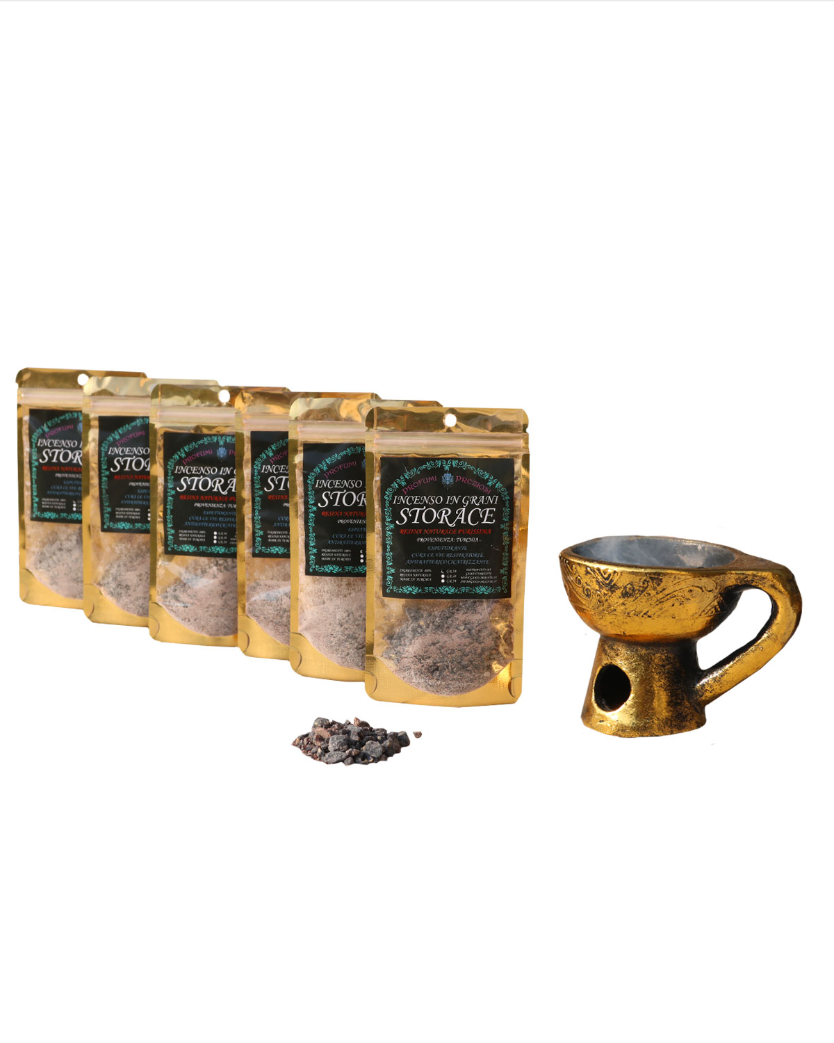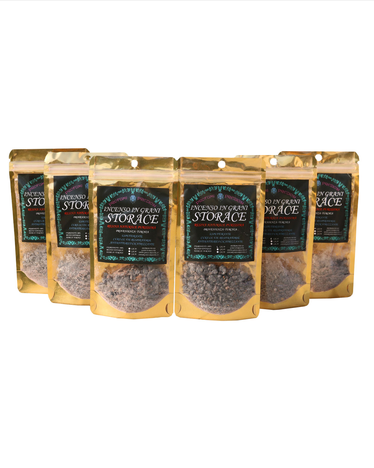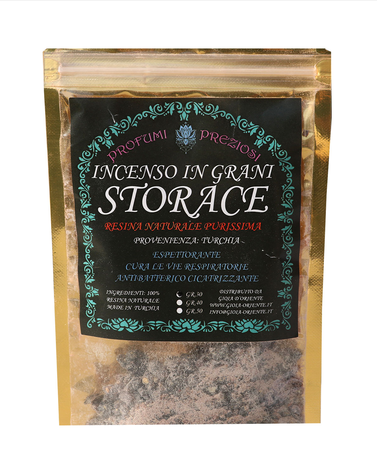 PROPRIETA’ E CARATTERISTICHE DELLA RESINA STORACE: Noto dall’antichità, lo Storace nero è il pregiato e famoso balsamo aromatico dell’Asia Minore e si ottiene dal Liquidambar Orientalis (Hamamelidacee) una pianta ad alto fusto che vegeta nelle impenetrabili foreste anatoliche del Marmaris. Ancor oggi la sua produzione è effettuata secondo la procedura originaria: energicamente percossa, la pianta in qualche settimana genera un denso siero patologico (lo storace resinoide, rinomata materia prima della profumeria). Questo viene successivamente asportato onde amalgamarlo con la corteccia del fusto (preventivamente triturata), il tutto rimane quindi sepolto per alcuni mesi. La fortunata macerazione che ne deriva dà origine al profumatissimo Storace nero. Da tempo immemorabile si usa sia bruciare questo balsamo insieme all’incenso, sia adoperarlo tal quale come efficace deodorante: comunque inebrierà l’ambiente con il suo orientale ed inconfondibile profumo dolce-ambrato. Lo storace è utile come diuretico, espettorante, e per le proprietà antibatteriche può essere usato anche per curare il mal di gola. Il suo profumo intenso non è adatto alle donne in gravidanza o durante l’allattamento. Deve essere usato con precauzione con i bambini. Come le altre resine pregiate (l’incenso e la mirra), lo Storace possiede stupefacente proprietà cicatrizzante ed espettorante ed un’affinità particolare con il cavo orale ed è indicato nella cura di malattie come tracheite, tonsillite e gengivite.