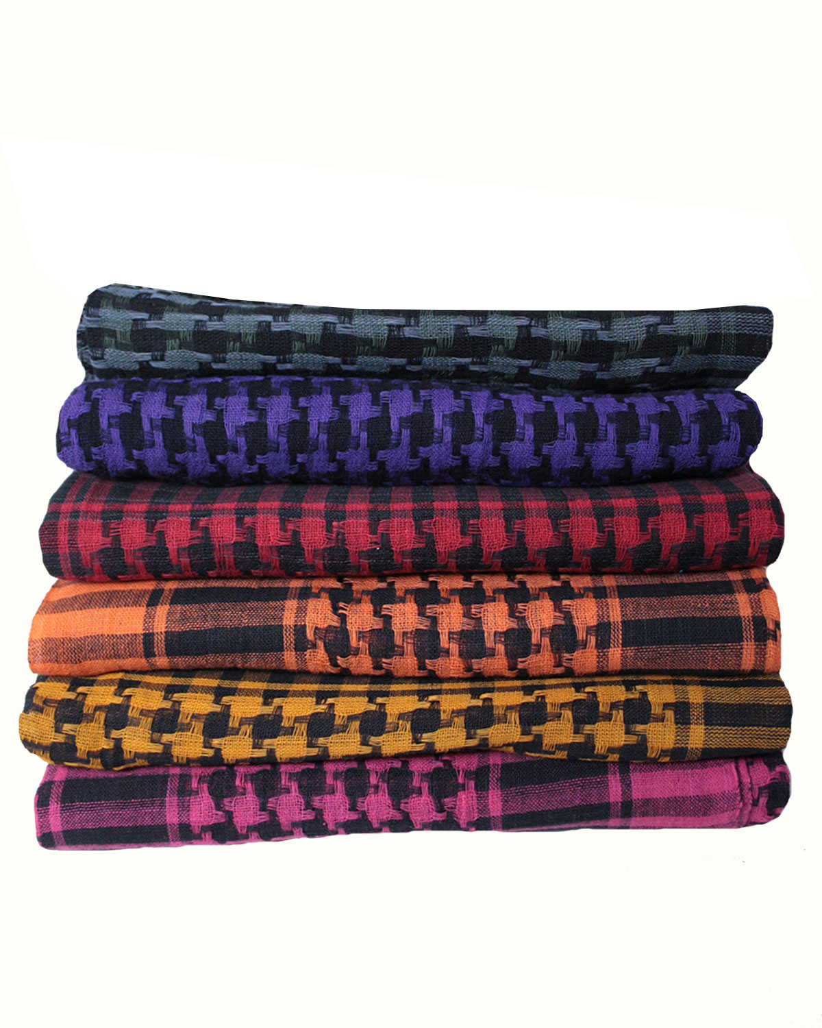 Originali sciarponi stile palestinese, unisex, giovanili e moderni, a quadretti bicolore, con bordatura di frangette sui quattro lati, realizzate in cotone 100% da sarti indiani. Disponibili nei colori rosso e nero, arancio chiaro e nero, arancio scuro e nero, fucsia e nero, bordò e nero. Misure cm 100 x 100.