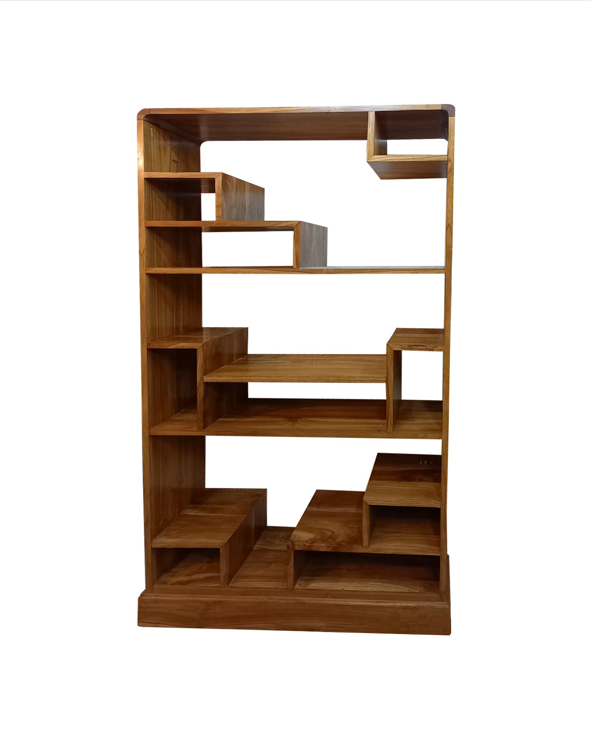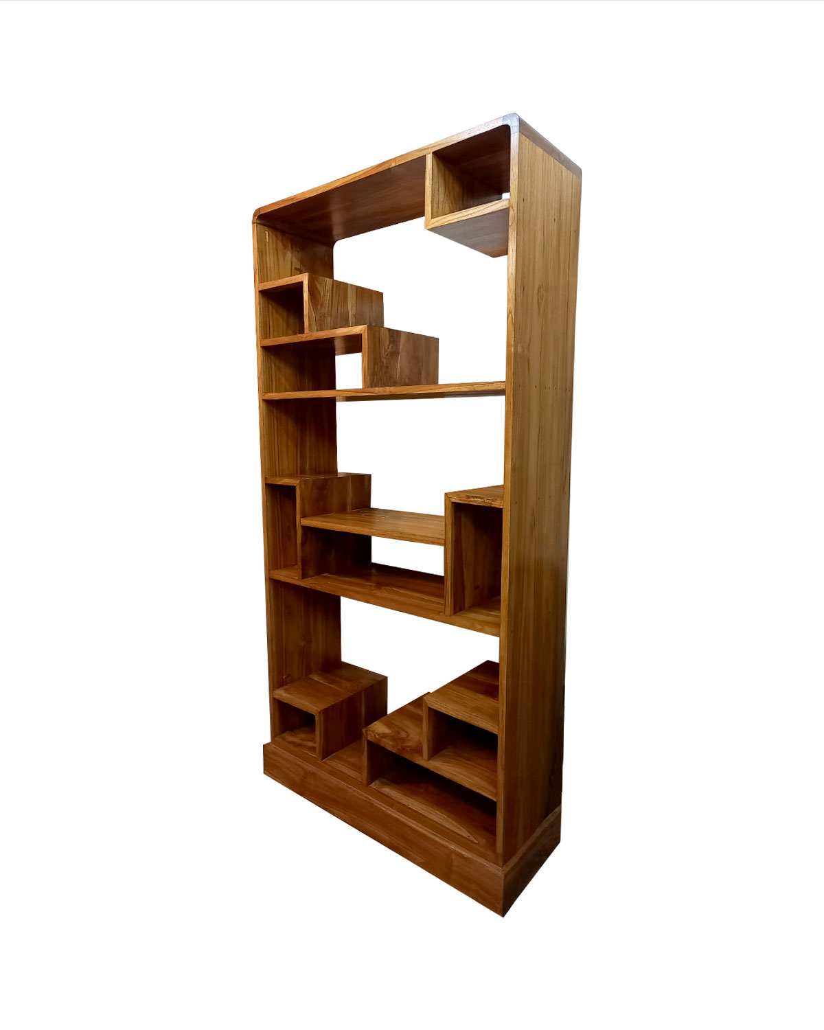 Originale libreria realizzata da falegnami indonesiani con tecniche artigianali in legno di teak massello. Dalla forma squadrata prresenta angoli arrotondati che le donano un aspetto piu’ dolce e sagomato. Dotata di ripiani a forma geometrica irregolare è utile per riporvi oltre a libri anche oggetti di varie dimensioni. Bella e utile per erredare sale, ingressi, studi, camere e centri olistici o in genere decorare pareti spoglie dato il modesto ingombro. Disponibile color teak chiaro naturale. Misure: larghezza base cm 101, larghezza massima cm 103, profondità cm 38, altezza cm 199.