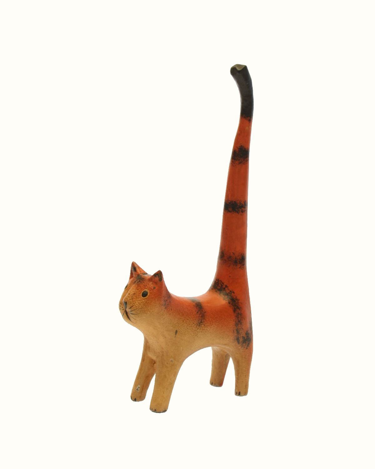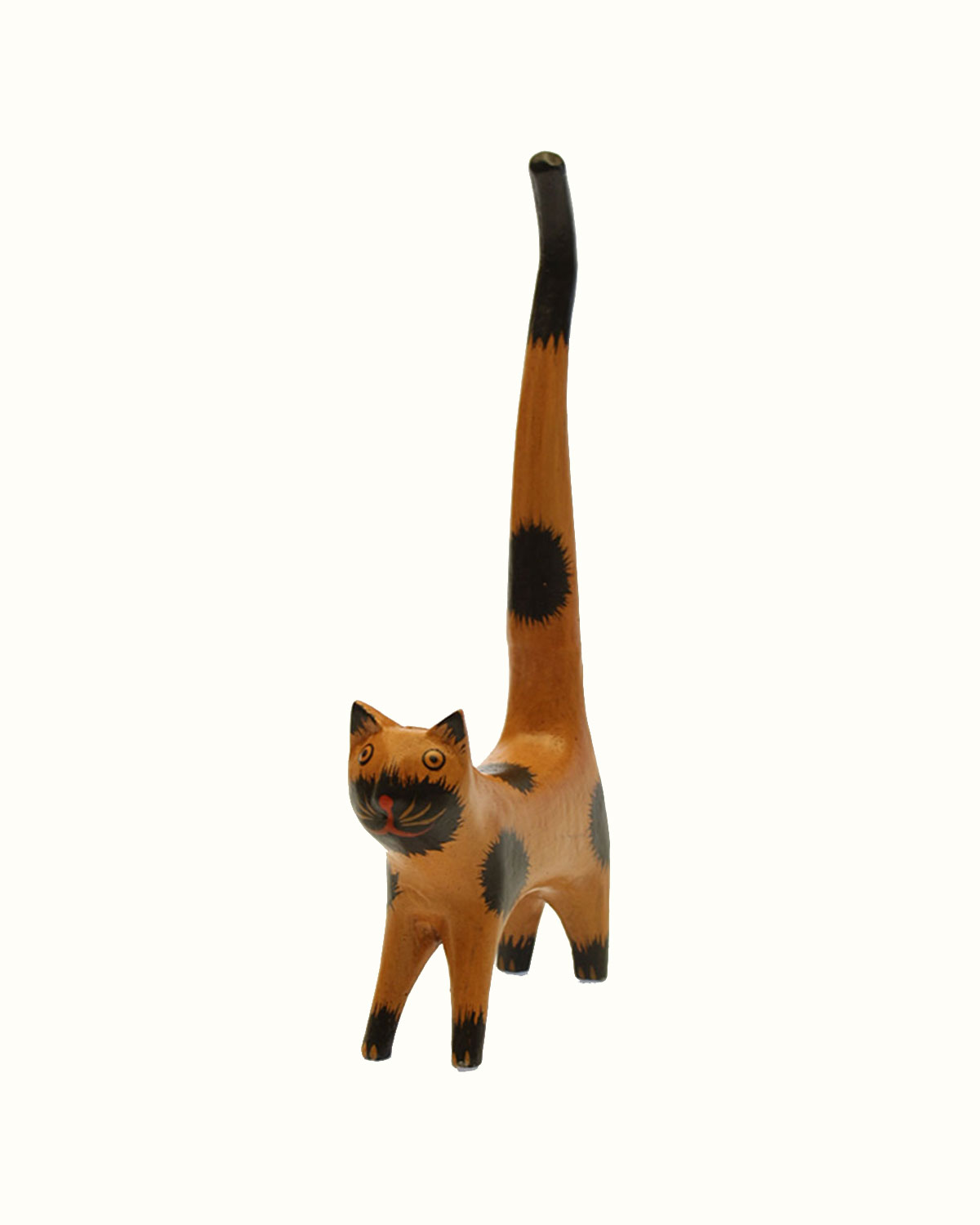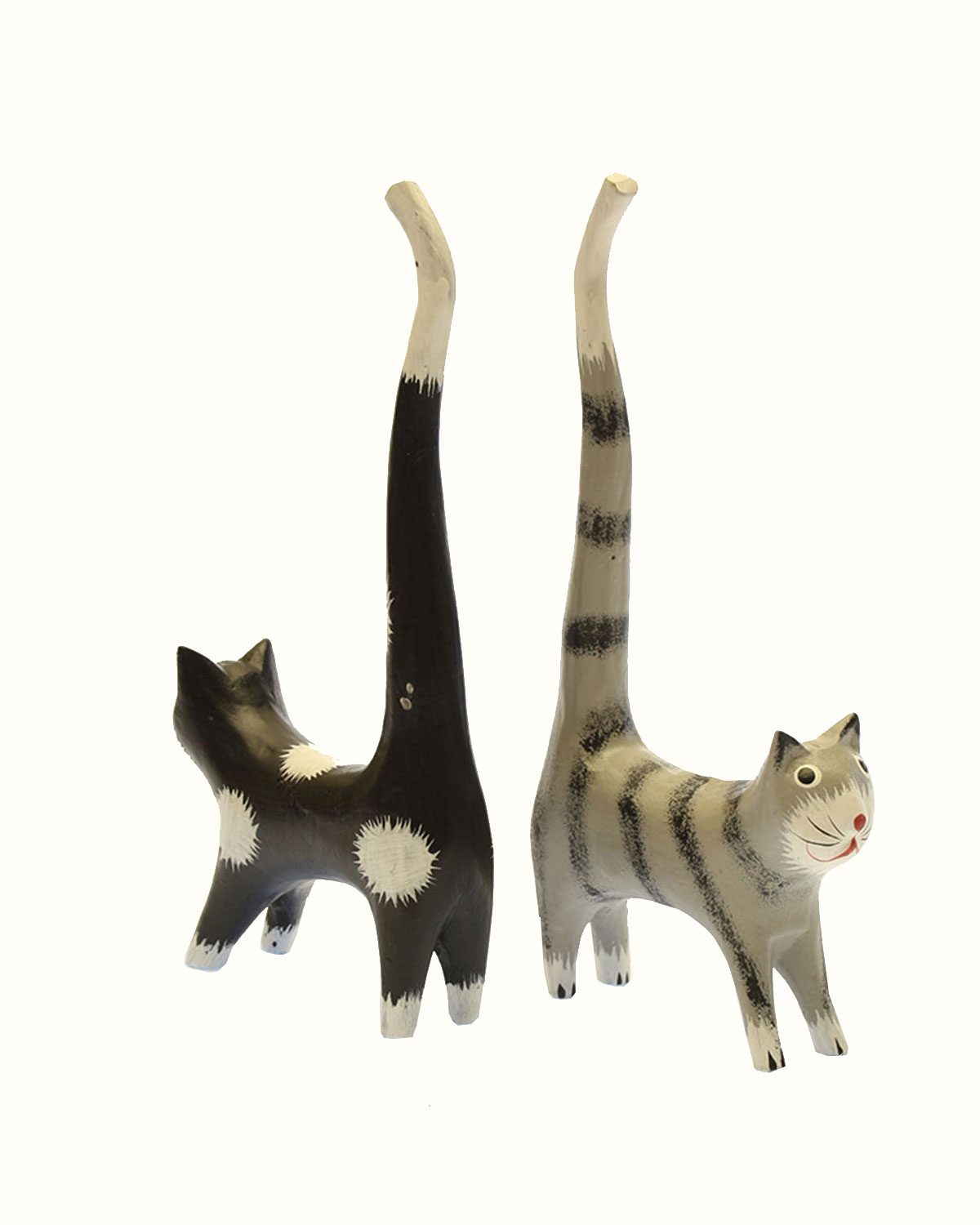 Graziosi micini portanelli, realizzati in legno, intagliati e dipinti a mano da artigiani indonesiani. Simpatici piccoli micini, grazie alla loro lunga coda sono dei funzionali porta anelli, piacevoli anche come pensierini portafortuna. Disponibili color nero, grigio, marroncino, rosso con striature più scure. Misure: cm 13 x 4, h cm 25.