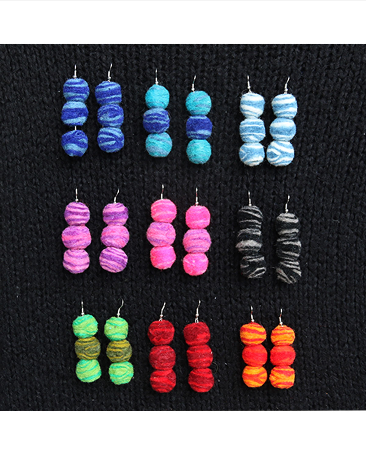 leggeri e graziosi orecchini realizzati da artigiani nepalesi in lana cotta con tecniche tradizionali nepalesi. Dotatidi monachelle in alluminio antiallergiche constano di 3 palline con motivi a spirale. Data la loro leggerezza si indossano piacevolmente per molte ore, donando anche un tocco di allegria e colore. Disponibili in tinta unita con motivi a spirale a tono o combinazioni di colori differenti. Misure: diametro palline cm 1,8, lunghezza totale senza monachella cm 5,con manachelle cm 7 circa.