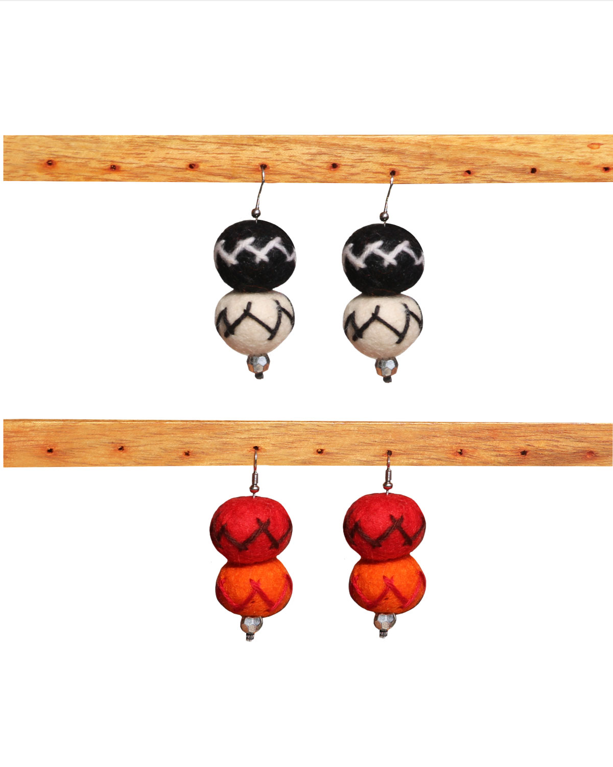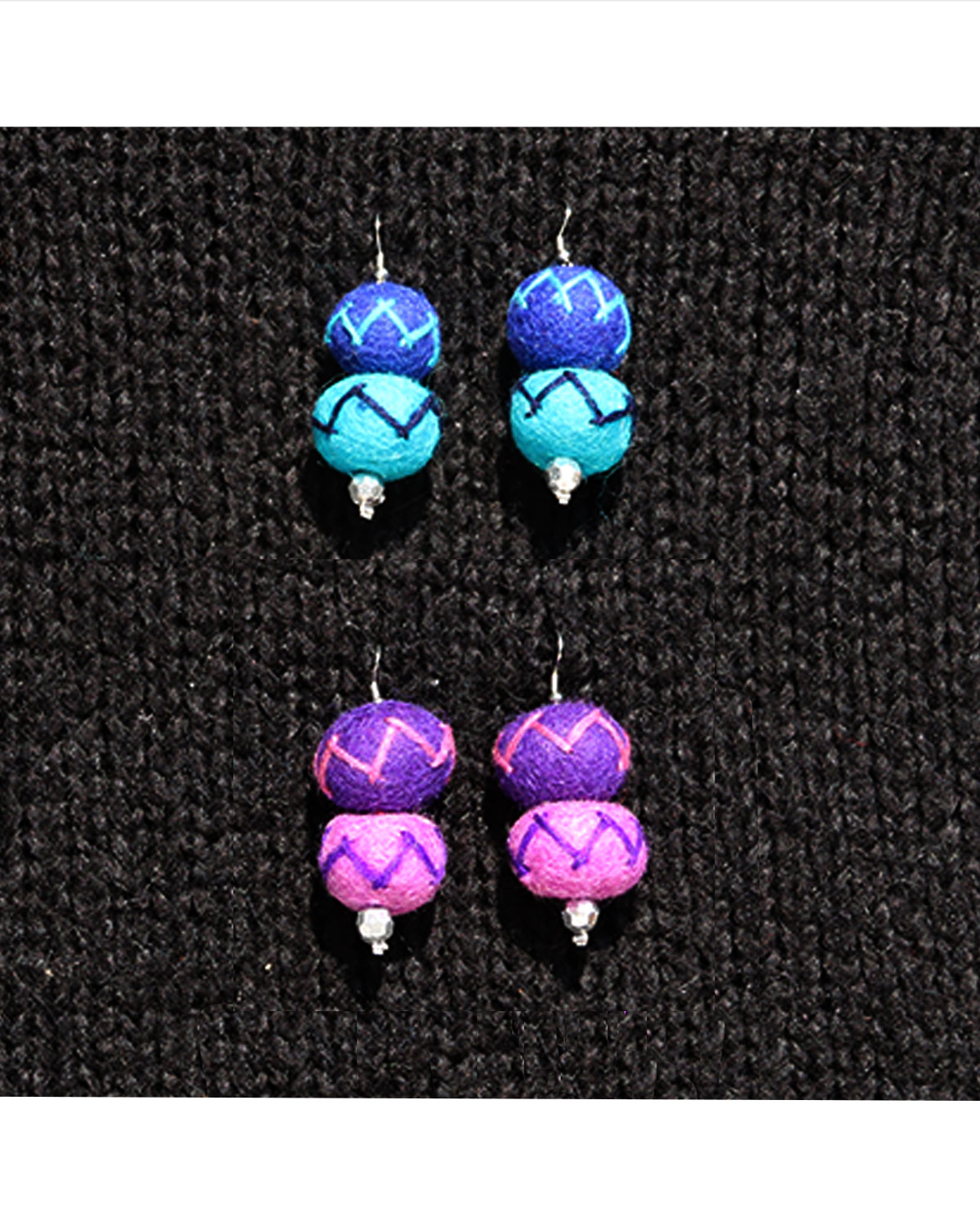 Morbidi e spiritosi orecchini realizzati in lana cotta da artigiani nepalesi con tecniche tradizionali di cardatura manuale . Originali ed allegri orecchini con perlina argentata finale, decoro in nuance di colore a zig zag e monachella in alluminio. Si indossano piacevolemente data la loro leggerezza., adatti a tutte le eta’, donano un delizioso tocco d’allegria. Disponibili in tinta unita o combinazione di colori.nuance. Misure: diametro palline cm 2,5, h senza monachella cm 5, con monachella cm 7.