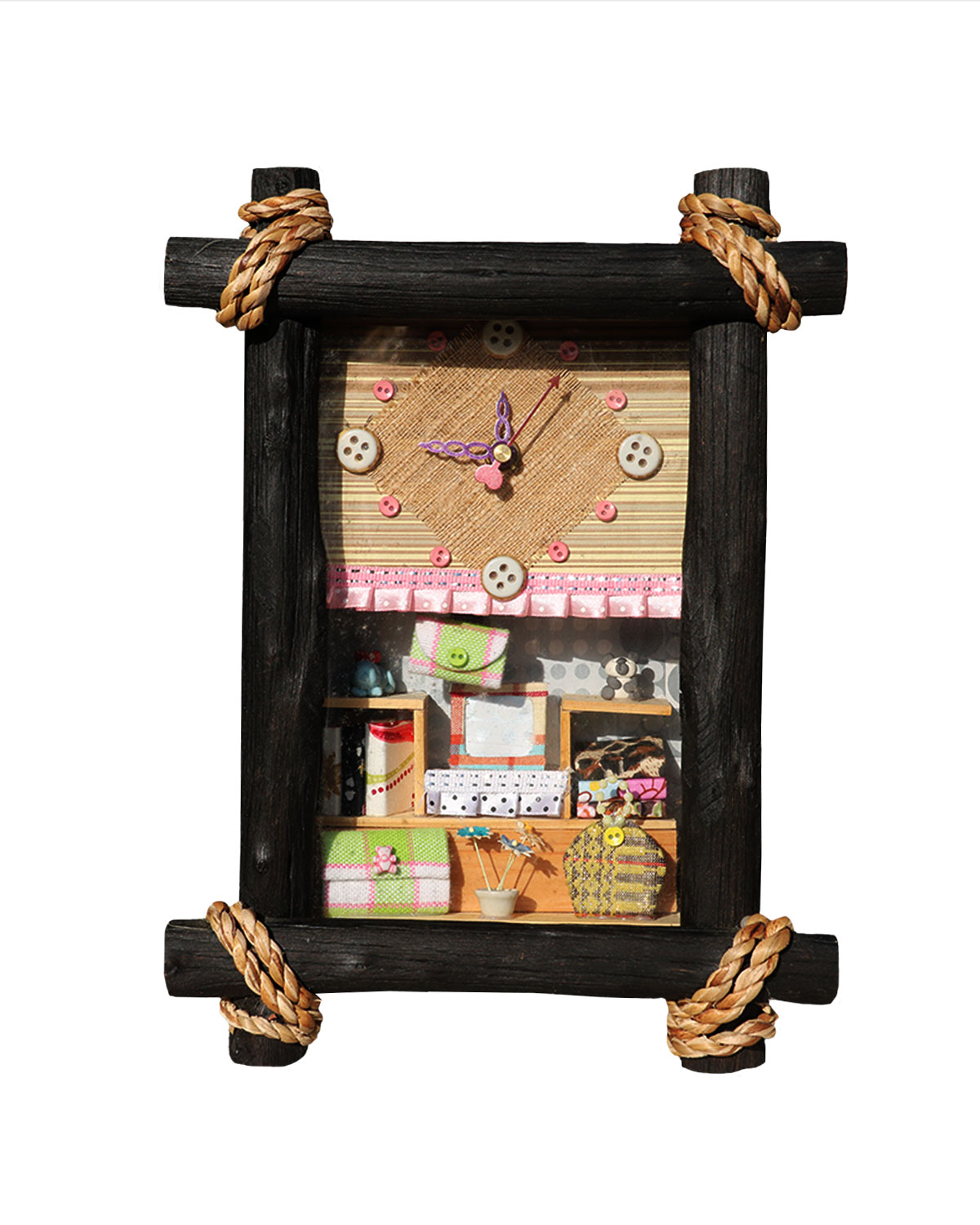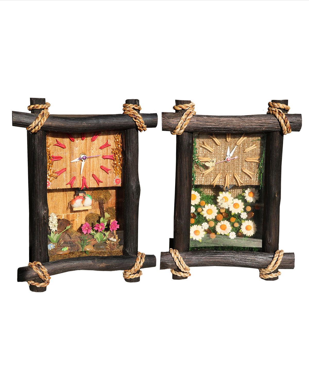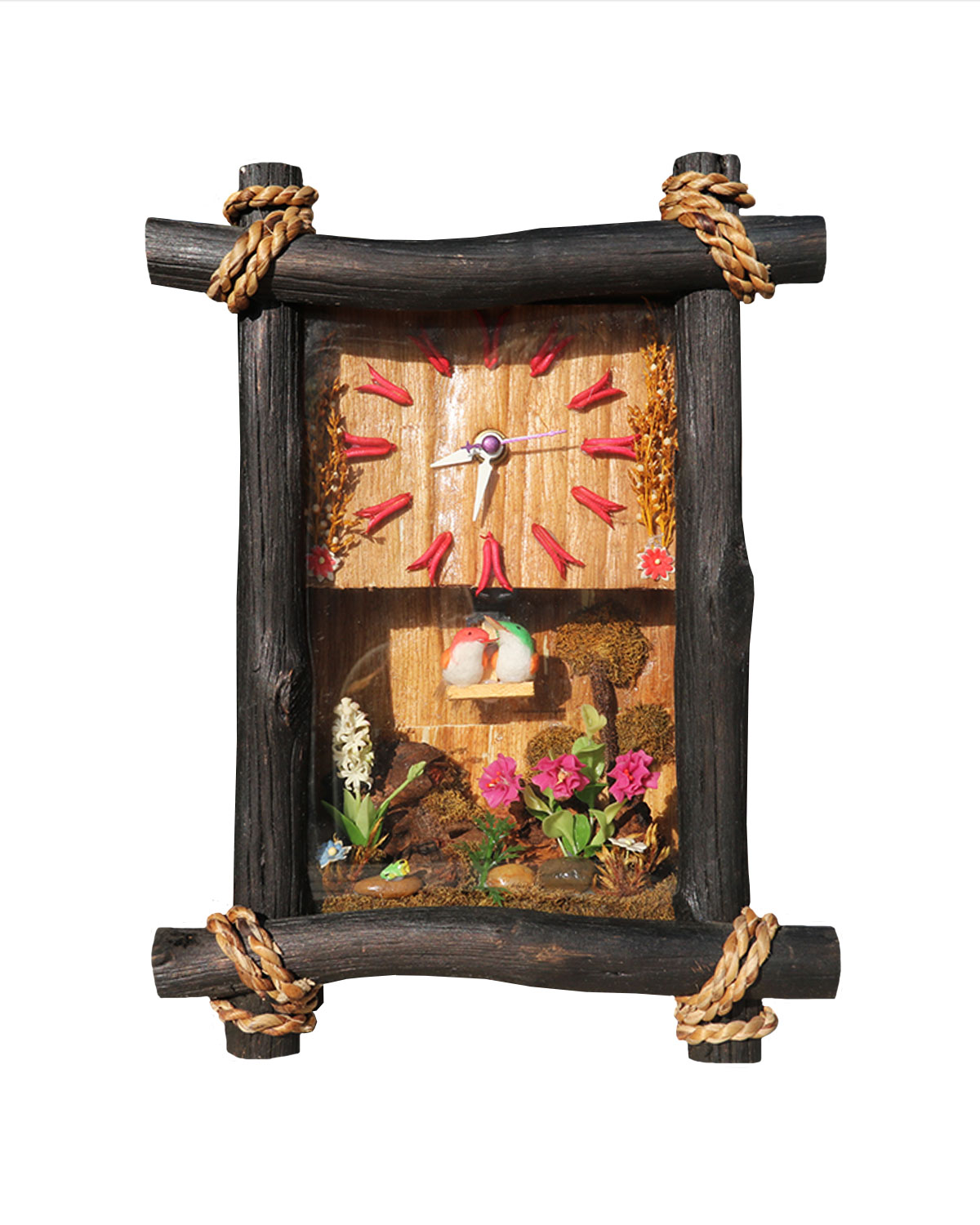 Originalissimi e particolari orologi da parete realizzati da artigiani thailandesi con materiali naturali quali legno, corda , cortecce, semi, fiori, vetro. Questi orologi sono realizzati con pazienza, curati nei minimi dettagli, dando vita a veri e propri quadretti artistici che inglobano al loro interno l’ orologio. Disponibili in varie combinazioni di soggetti come da foto. Misure: cm 21 x h 28 x spessore cm 9.