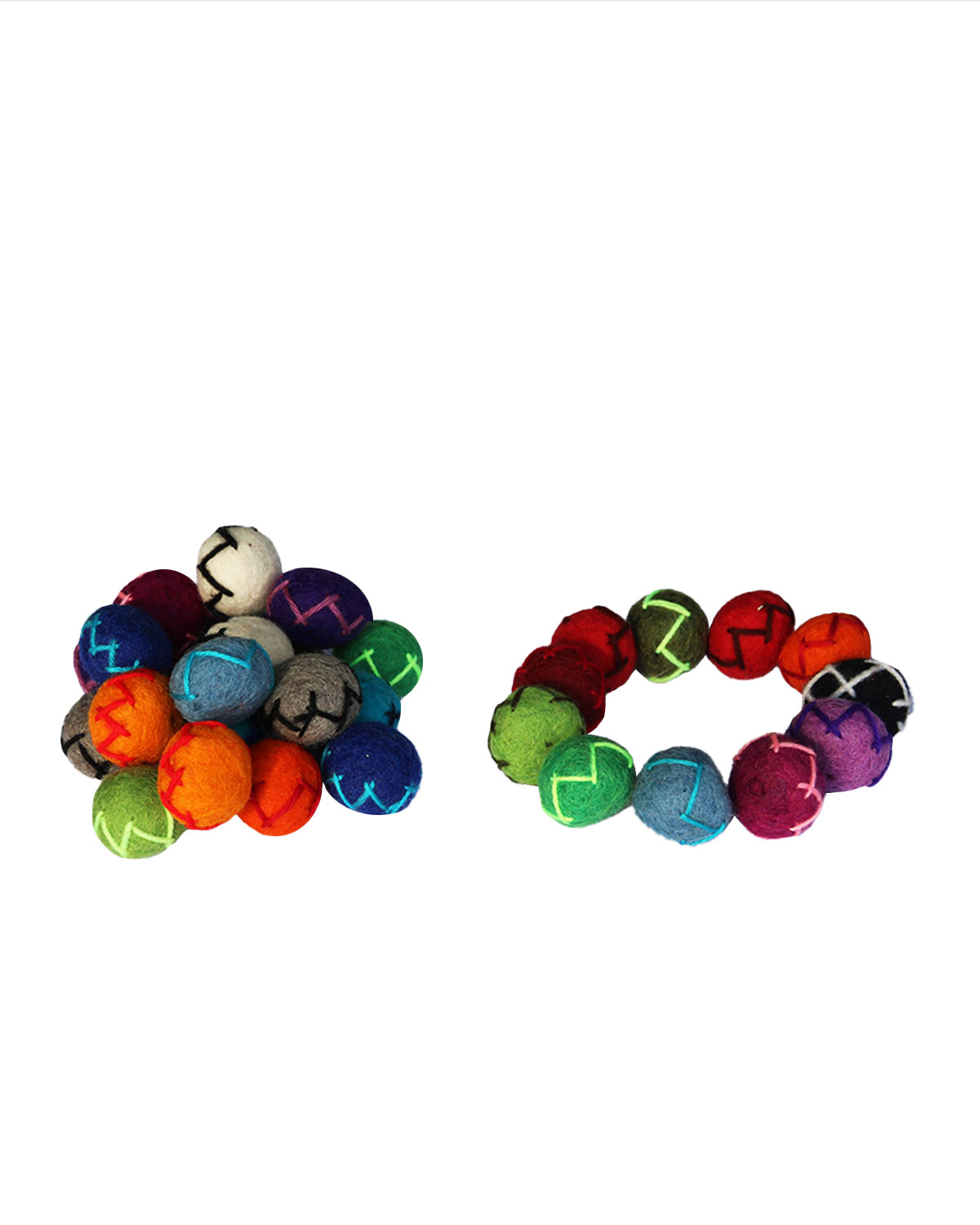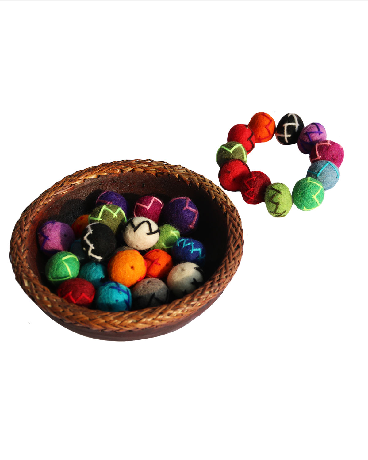 Allegre e morbide palline realizzate in feltro di pura lana da sarti nepalesi. Dotate di buco per infilarle e decoro a zig zag.Adatte a creare fantastiche collane, bracciali o qualsivoglia “gioiello”. Disponibili in sacchettini da 20 palline tinta unita con decoro in nuance di colore. Misura: diametro di ogni singola pallina cm 2,5.
