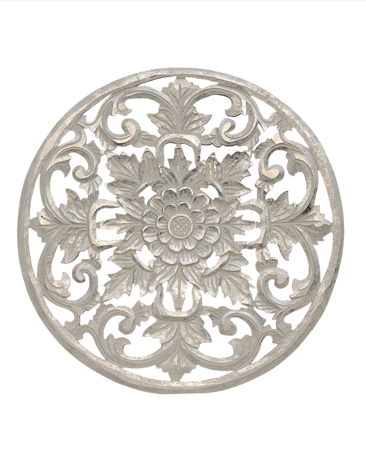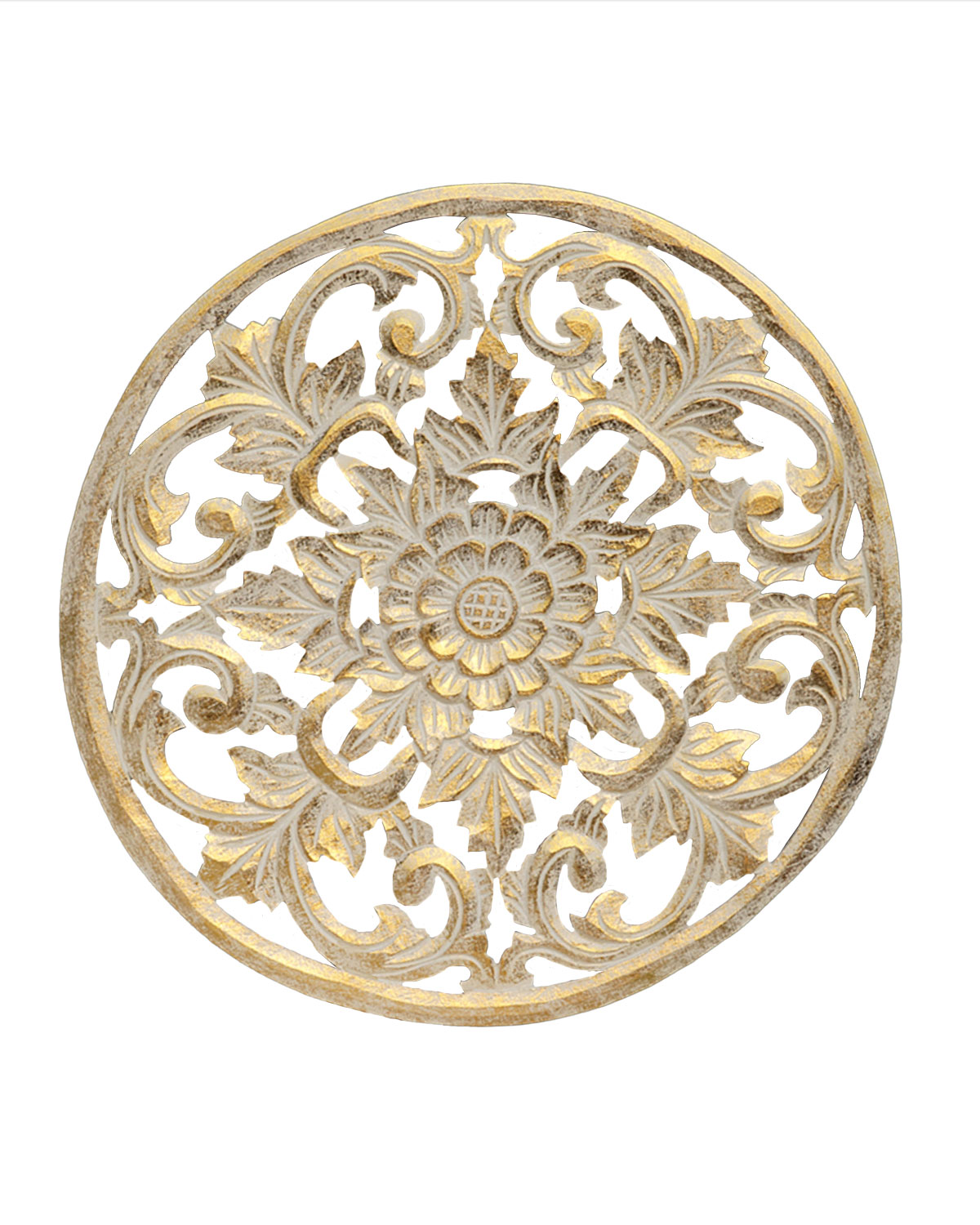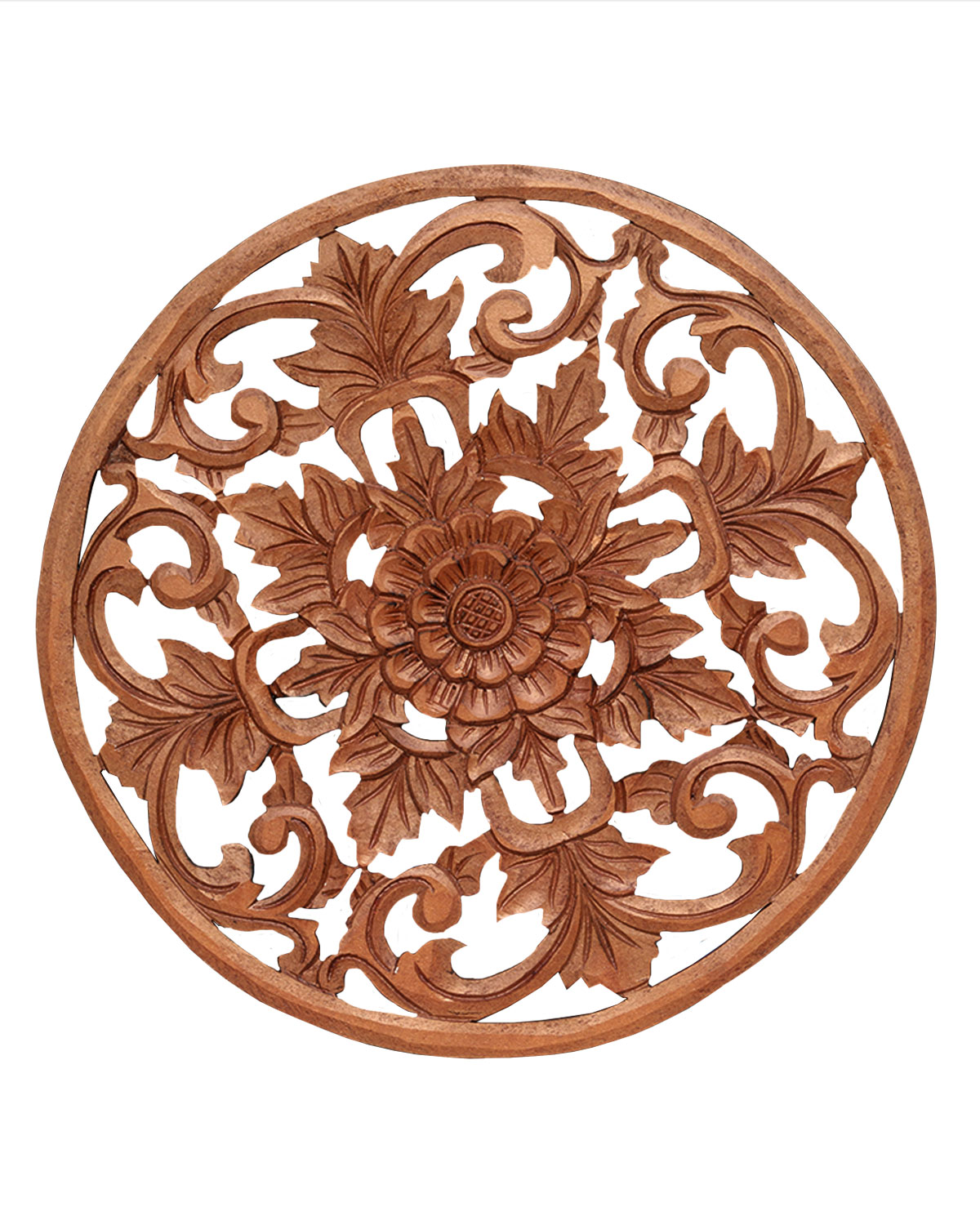 Luminosi e ricchi pannelli decorativi realizzati in legno esotico, interamente intagliati a mano da artigiani indonesiani, con antiche tecniche manuali, che danno vita a preziosi intagli in stile classico dal sapore orientale con un fiore centrale tipo margherita. Curati e dettagliati vengono decoati a mano dando prima una base bianca e poi dorati o argentati oppure dando due mani di color marrone. Arredano con gusto ogni ambiente, donando un tocco di eleganza etnica. Belli come rosoni di lampadari, per ravvivare la parete spoglia di una sala, un ingresso o anche come centrale di un sopraletto. Disponibili nei color bianco sfumato oro, bianco sfumato argento o noce medio. Misure: diametro cm 50 circa, spessore mm 8 circa.