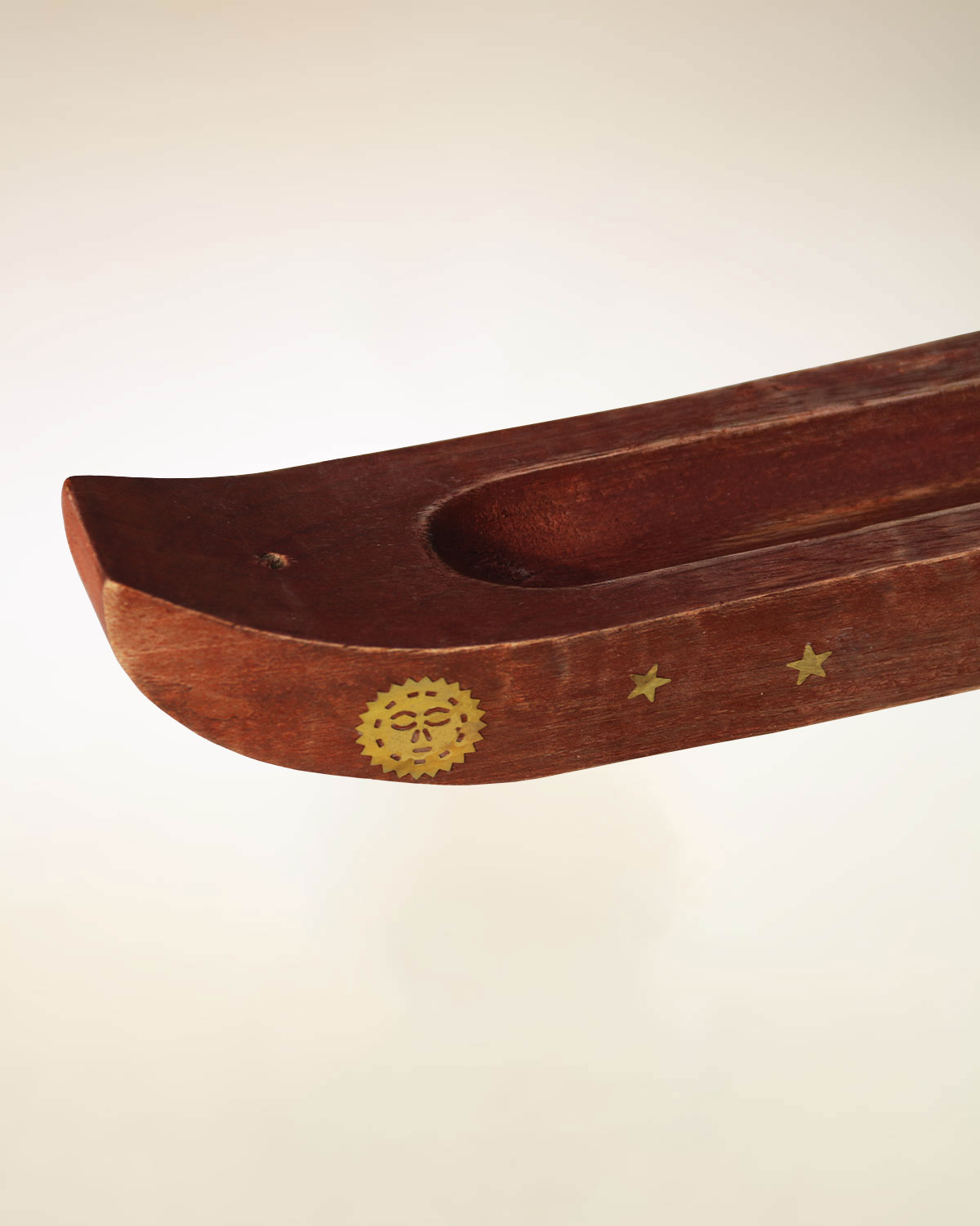 Comodi e funzionali portaincensi realizzati ia mano in India, in legno di mango, con intarsi in ottone. A forma di canoa, raccolgono al loro interno parecchia cenere. Disponibili color noce medio, con intarsi in ottone che rappresentano luna e stelle o motivi floreali. Misure: lunghezza cm 25, spessore del legno cm 2,2 circa, larghezza cm 5.