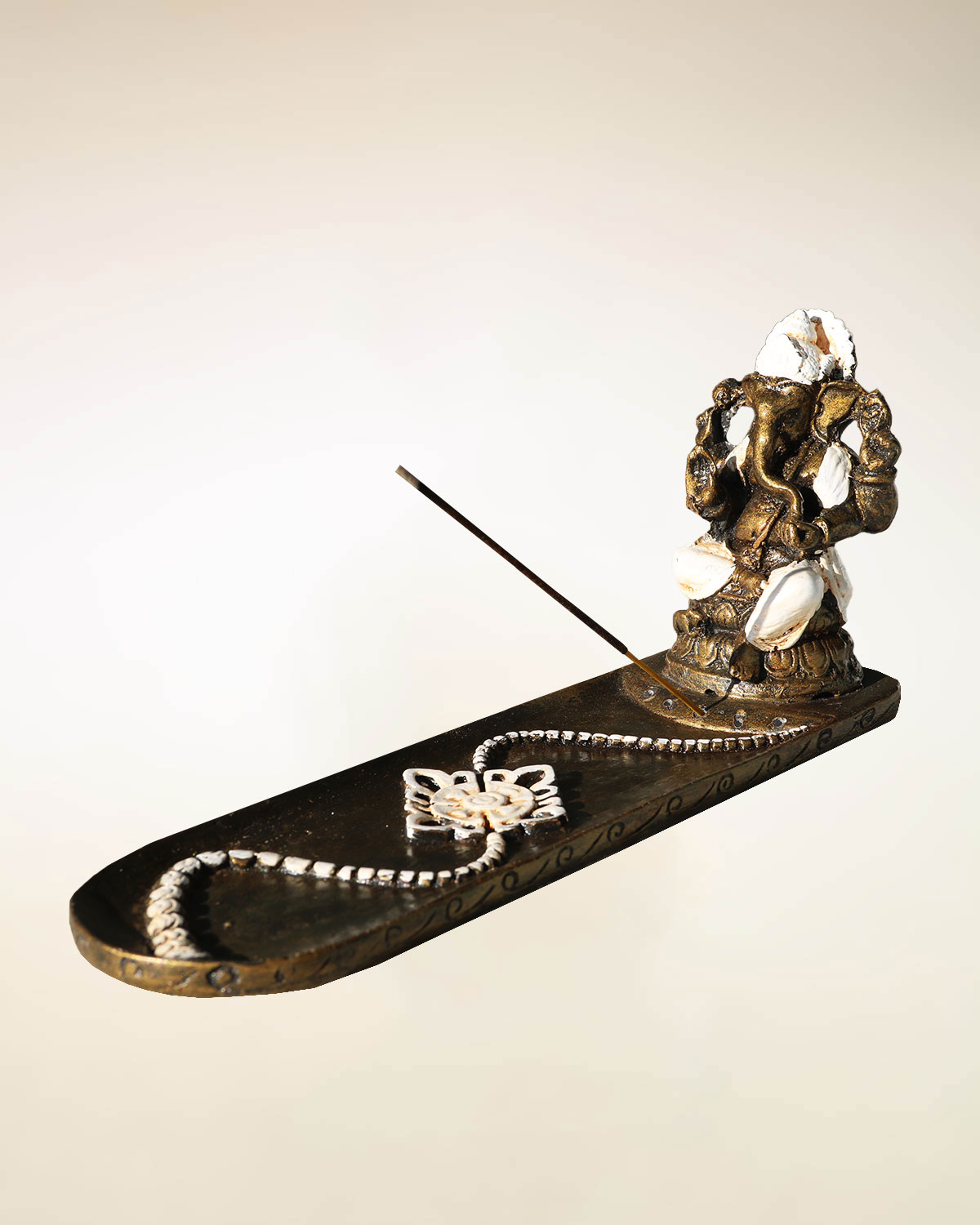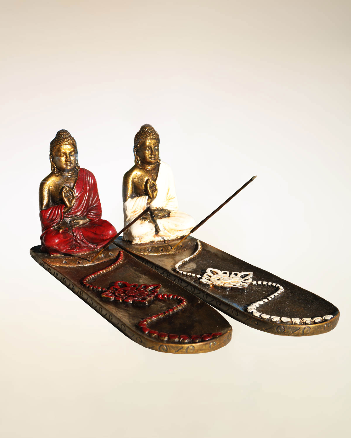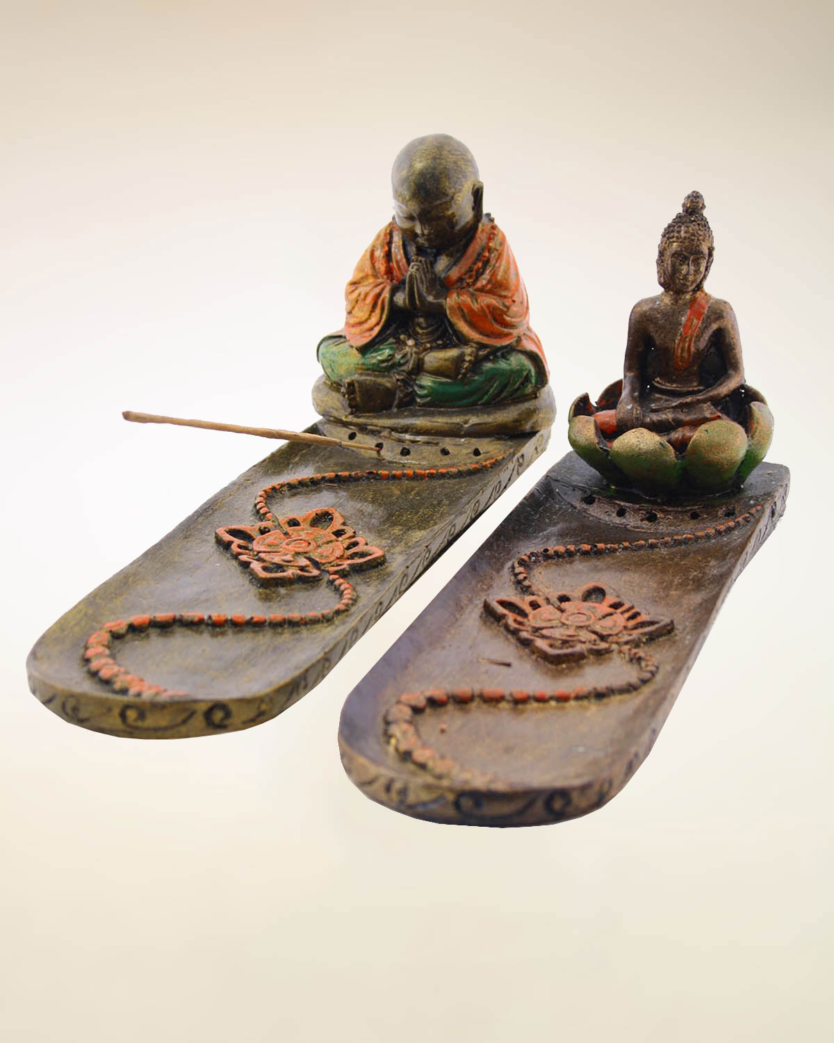 Portaincensi molto particolareggiati, realizzati in resina da artigiani indonesiani, con divinità quali Buddha con mano om, Buddha bambino, Buddha nel loto e Ganesh e decorazioni per tutta la lunghezza del raccoglipolvere. Comodi e capienti per raccogliere la cenere di molti bastoncini, donano un magico tocco sacro all’ambiente. Disponibili con Buddha con veste rossa o bianca, Ganesh con veste panna e Buddha bambino e Buddha nel loto con veste arncio e verde. Misure: lunghezza cm 28-30, altezza cm 10-12, larghezza cm 8.