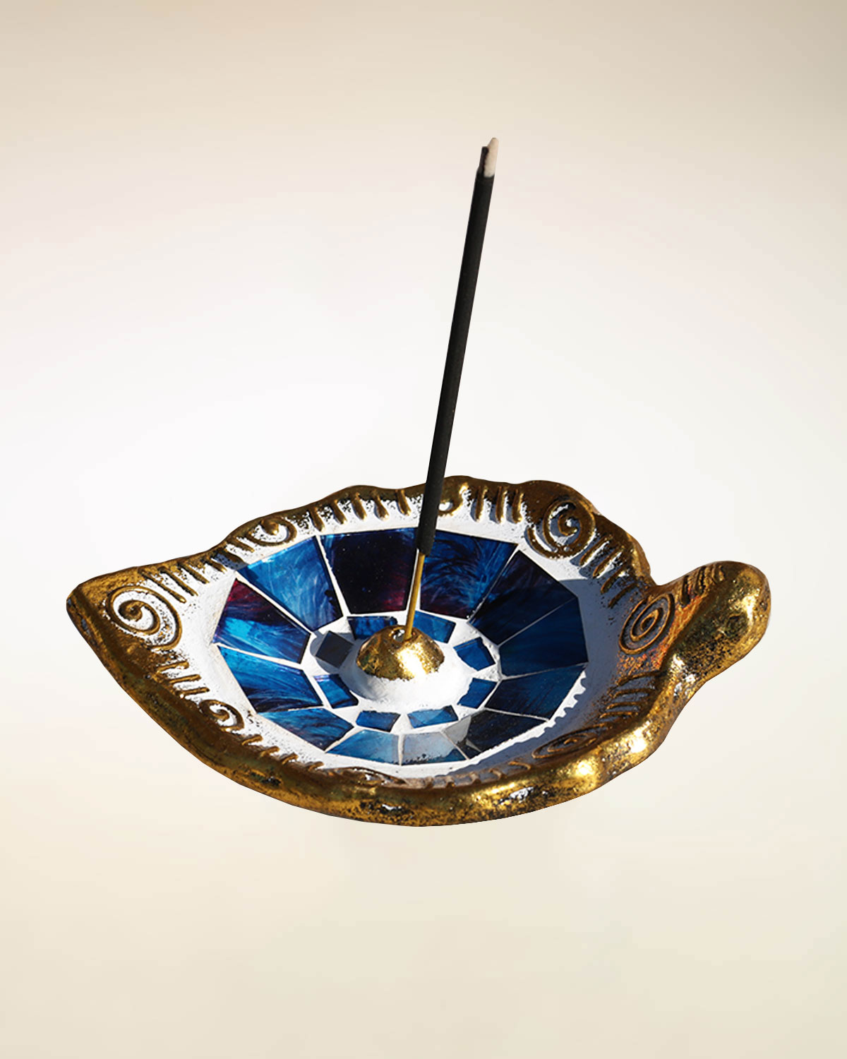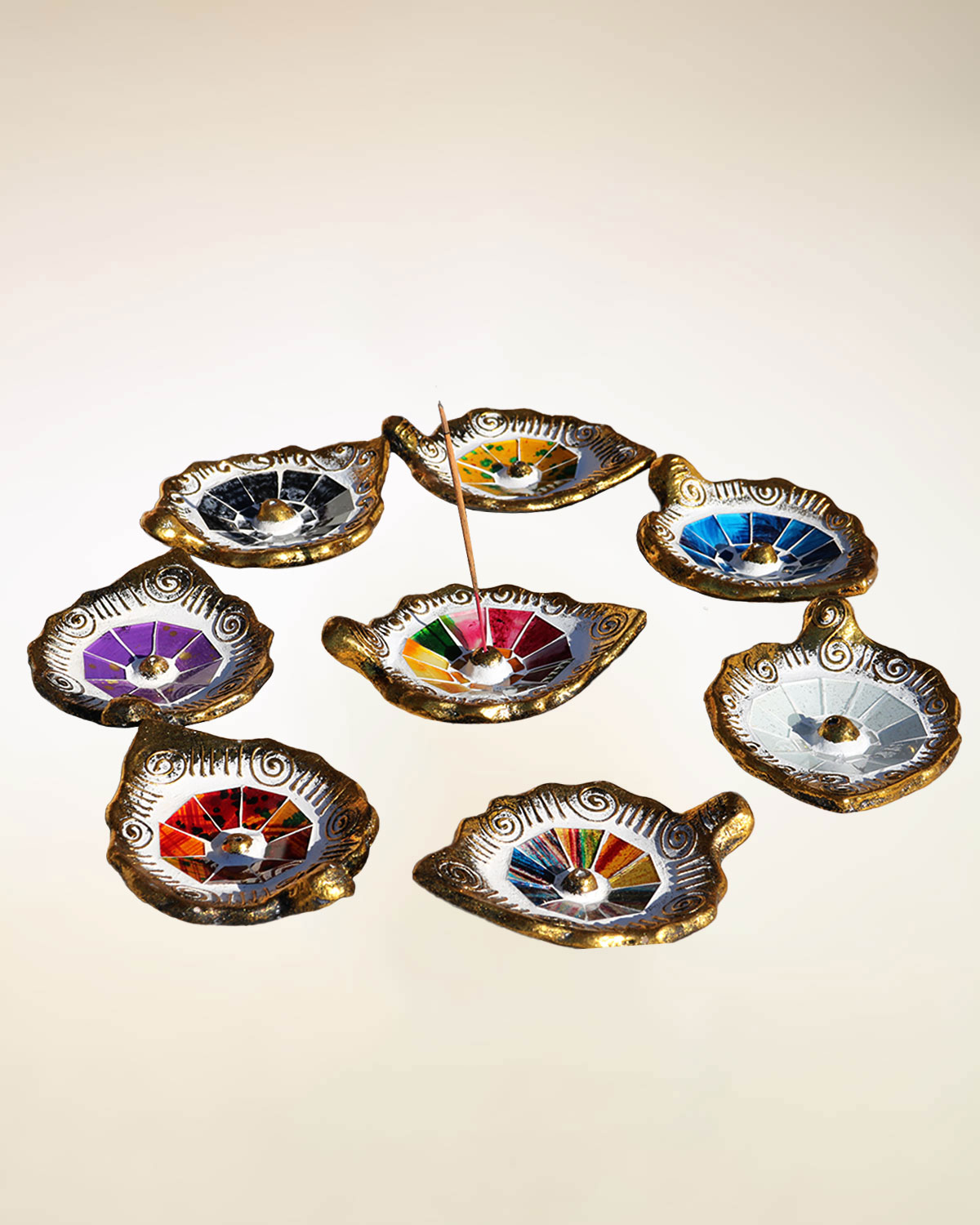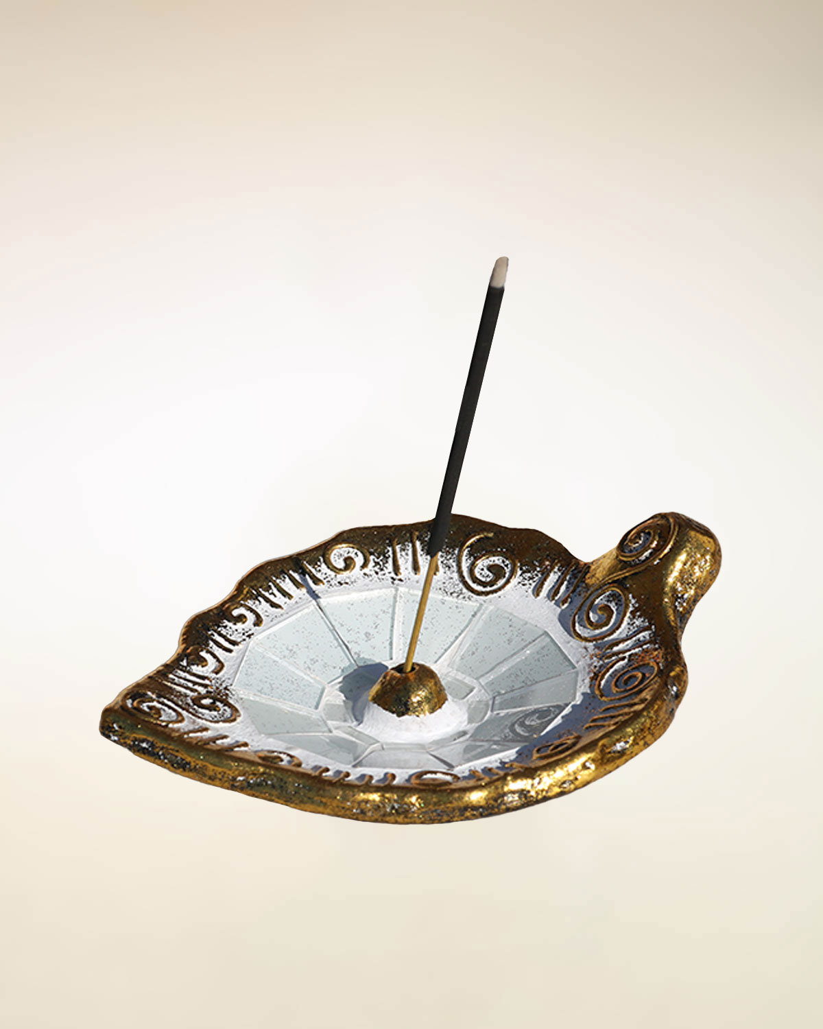 Graziosi e luminosi portaincensi a forma di goccia realizzati a mano con tecniche artigianali da pazienti artigiani indonesiani. In terracotta naturale ricoperta di specchietti colorati e bordi dorati con decori a rilievo. Si utilizzano bruciando il bastoncino in verticale e in questo modo raccolgono anche la cenere dell’ incenso bruciato. Belli per dare un tocco luminoso ad un tavolino o una mensola, utili per raccogliere la polvere all’ interno. Disponibili con sfondo bianco e decori oro e specchietti color arancio, giallo, multicolor, bianco, nero, turchese e viola. Misure: cm 13,5 x 10 x h 4.