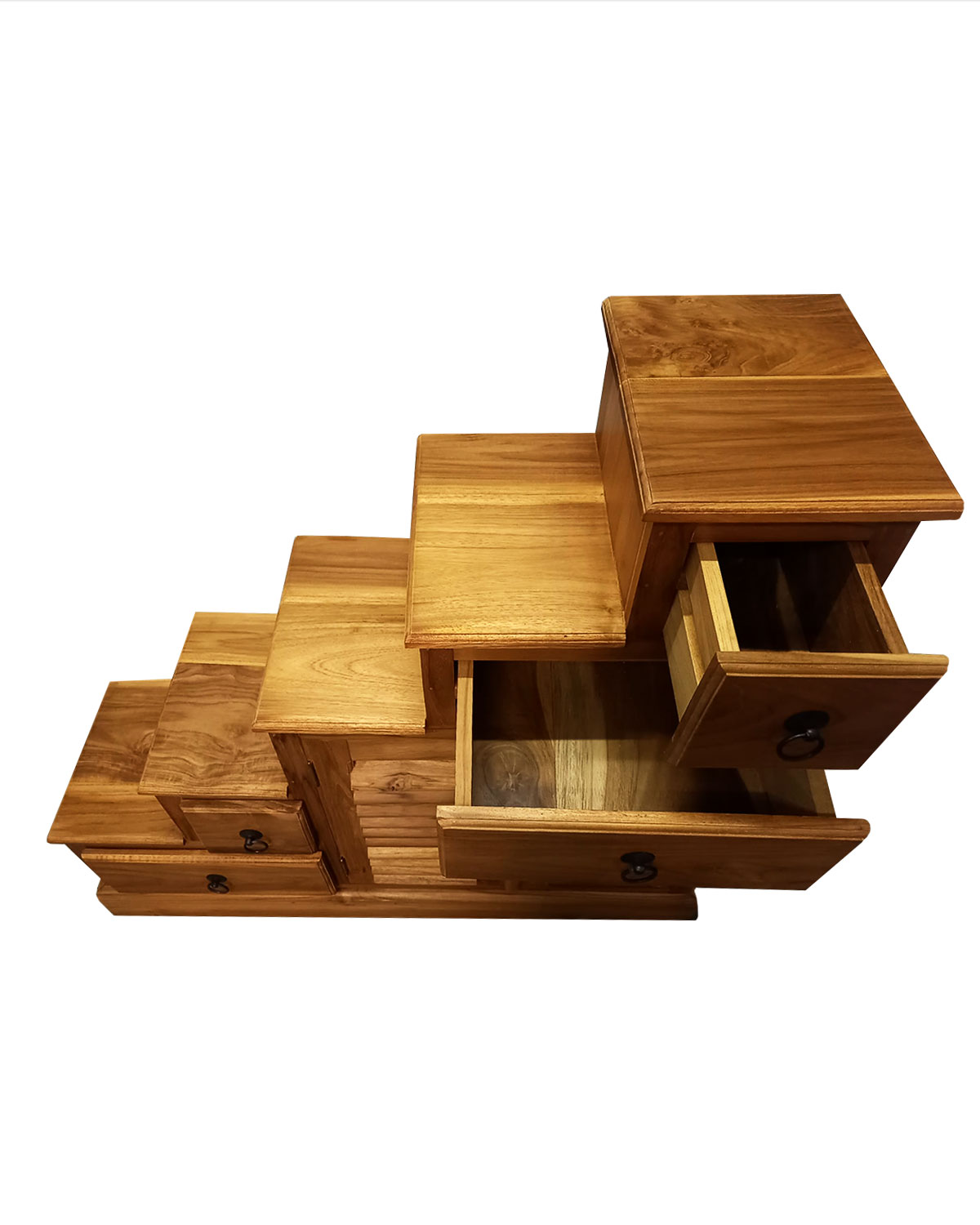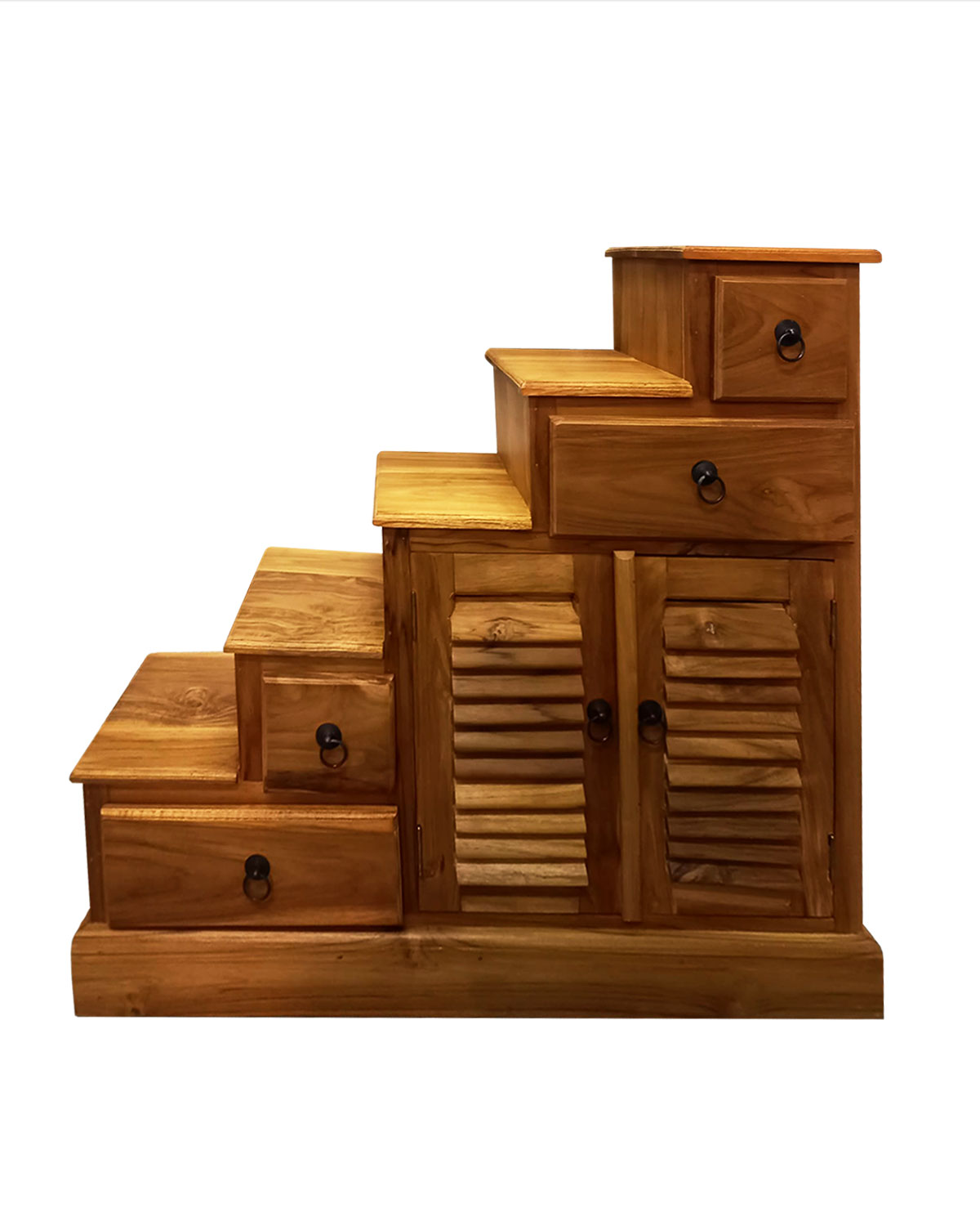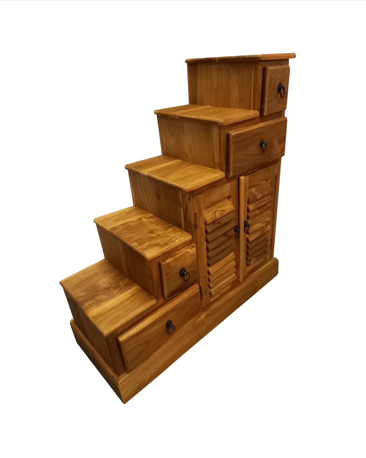 Funzionale e decorativa scaletta con 2 antine e 4 cassetti realizzata da falegnami indonesiani in legno di teak massello con tecniche artigianali. Le antine sono realizzate in stile anta veneziana- Dalla forma particolare è dotata di manigliette ad anello nere antichizzate. Disponibile color teak chiaro. Si sviluppa dall’ alto verso il basso in direzione destra. Misure: larghezza base cm 90, profondità cm 28, altezza cm 82, gradini cm 21 x profondità cm 28, chilogrammi 22 circa..