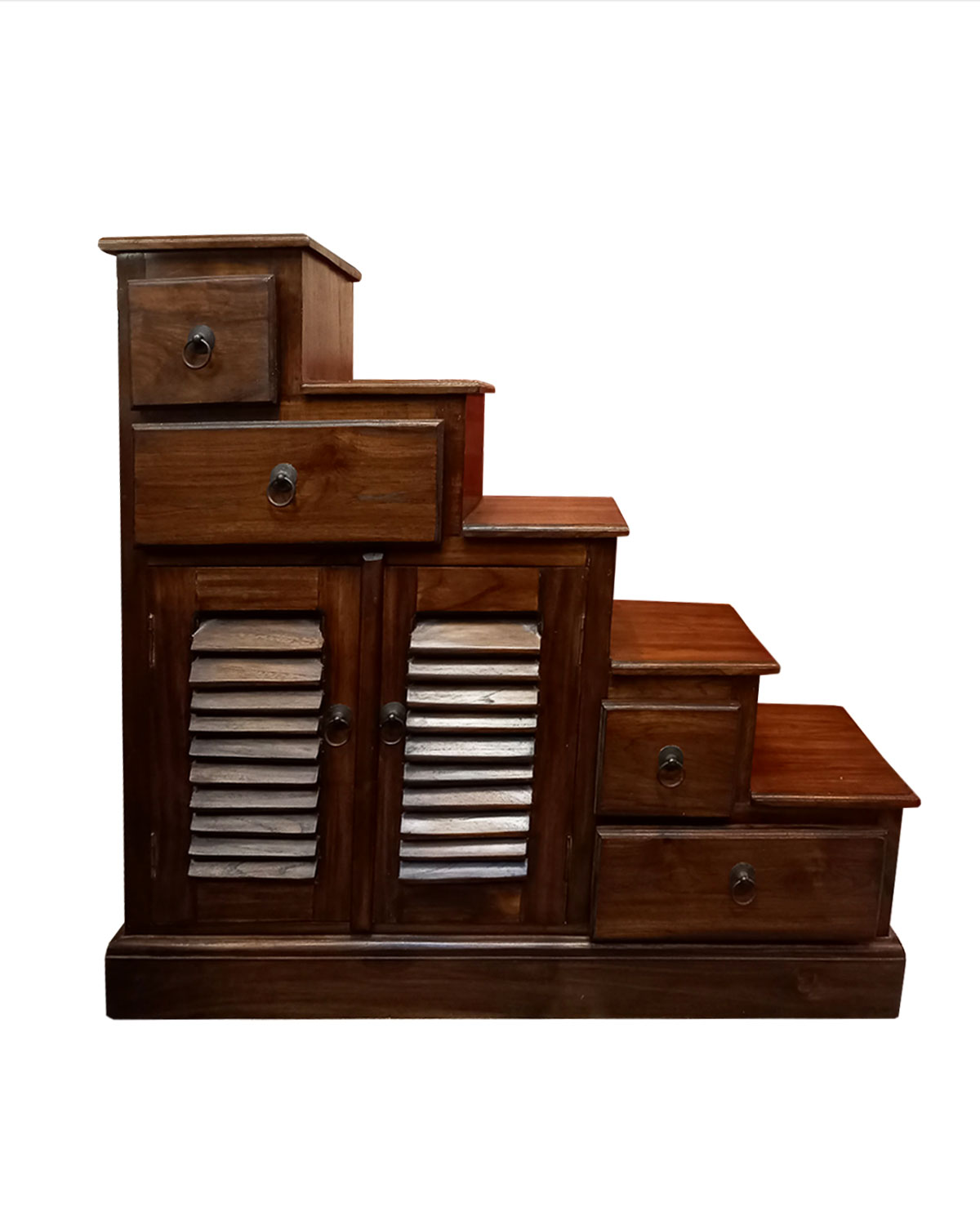 Funzionale e decorativa scaletta con 2 antine e 4 cassetti realizzata da falegnami indonesiani in legno di teak massello con tecniche artigianali. Le antine sono realizzate in stile anta veneziana- Dalla forma particolare è dotata di manigliette ad anello nere antichizzate. Si sviluppa dall’ alto verso il basso in direzione sinistra. Disponibile color noce scuro. Misure: larghezza base cm 90, profondità cm 28, altezza cm 82, gradini cm 21 x profondità cm 28.Chilogrammi 22 circa.