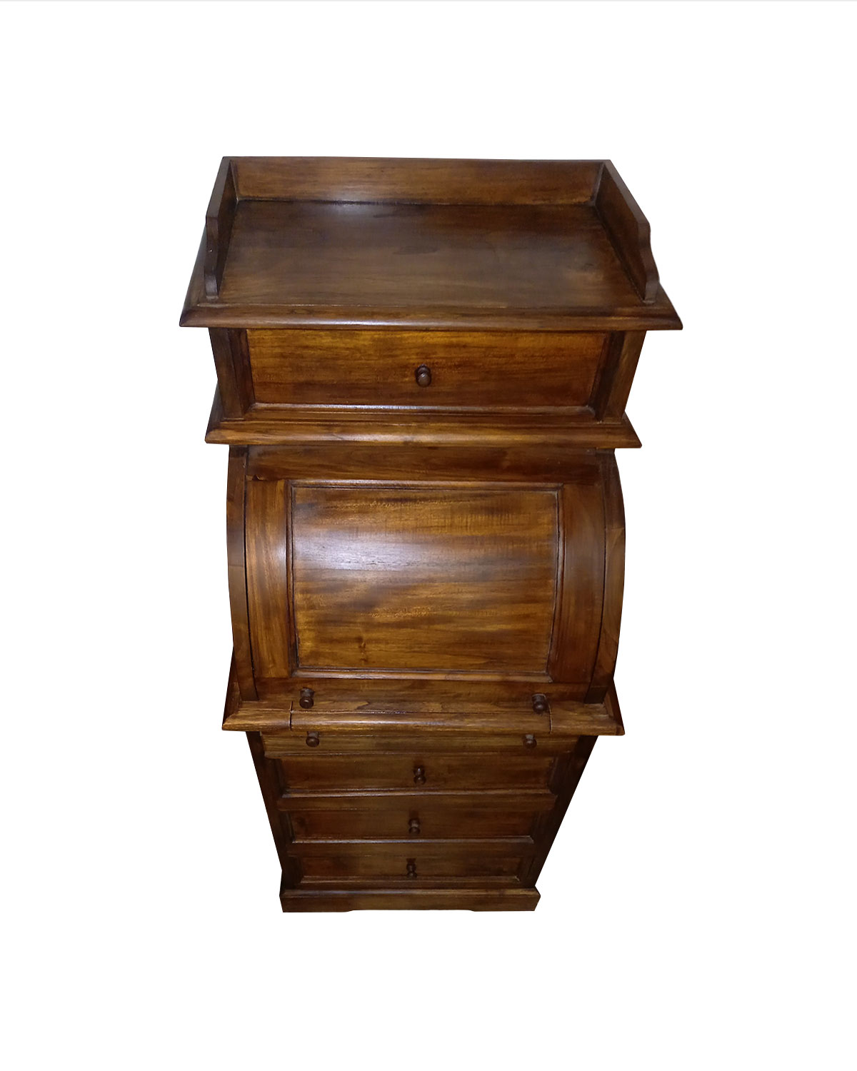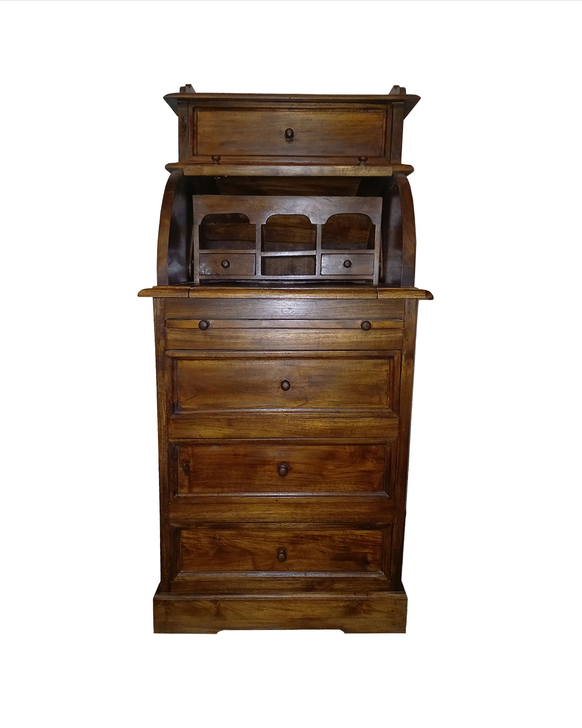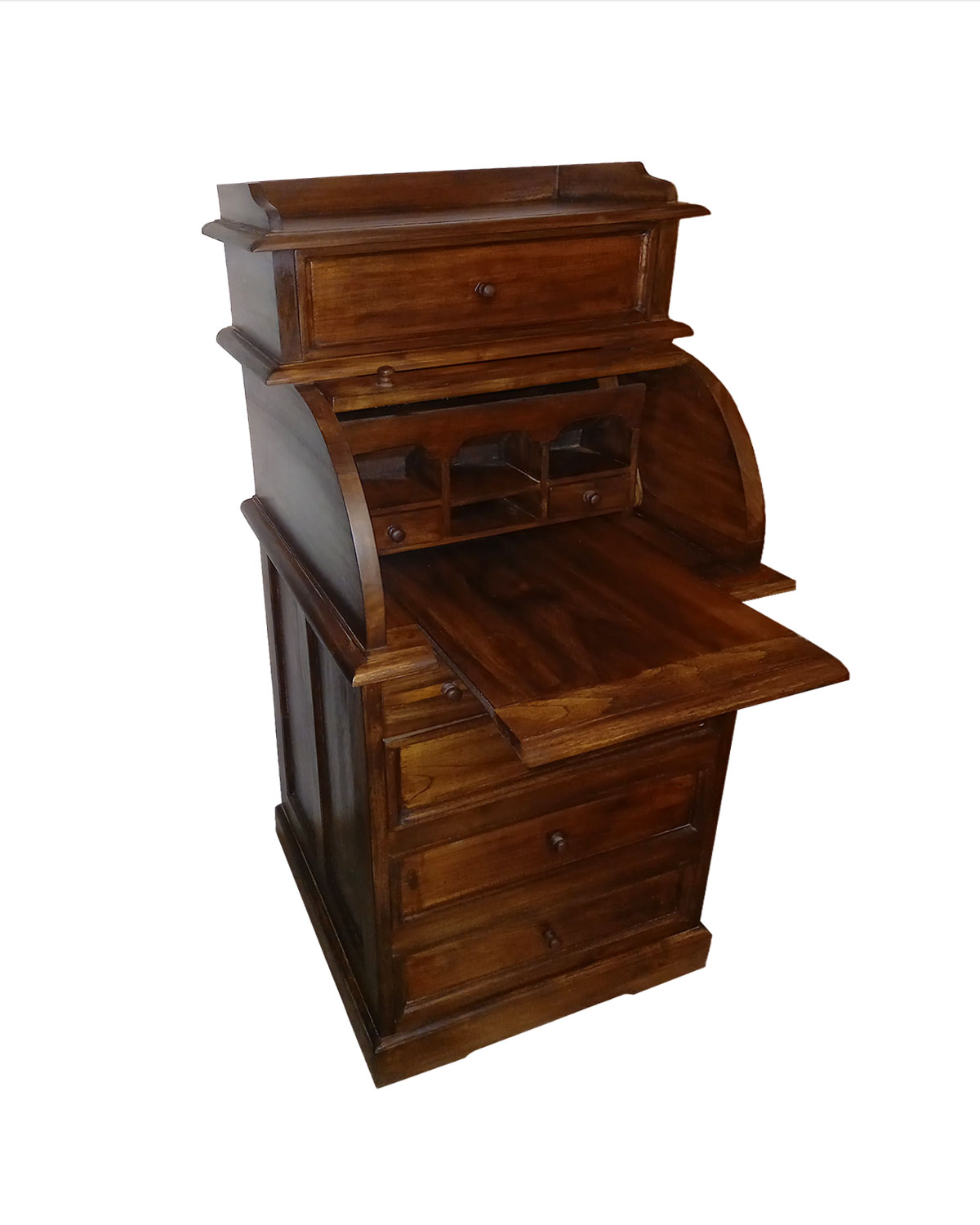Bellissimo e curatissimo scrittoio realizzato da falegnami indonesiani in legno di teak massello con tecniche artigianali. Molto curato nei dettagli. Estremamente funzionale è dotato di 4 cassetti lunghi e 2 piccoli, chiusura con ribaltina sul fronte e piccolo tavolino estraibile. Disponibile in legno di teak color noce medio. Misure: larghezza cm 53, profondità da chiuso cm 49, altezza cm 115, chilogrammi 36 circa.