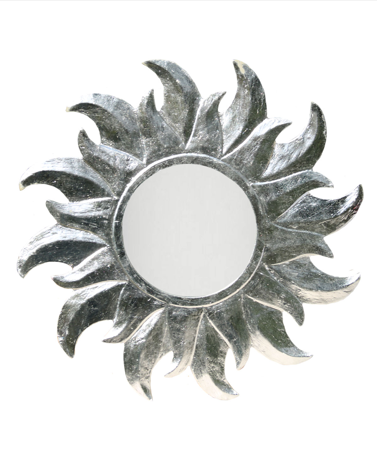 Delicati e luminosi specchi con raggi, realizzati in legno esotico indonesiano con tecniche manuali da artigiani locali. A forma di sole. Disponibili color argento. Misure: diametro cm 40, diametro solo specchio cm 15, spessore mm 8.