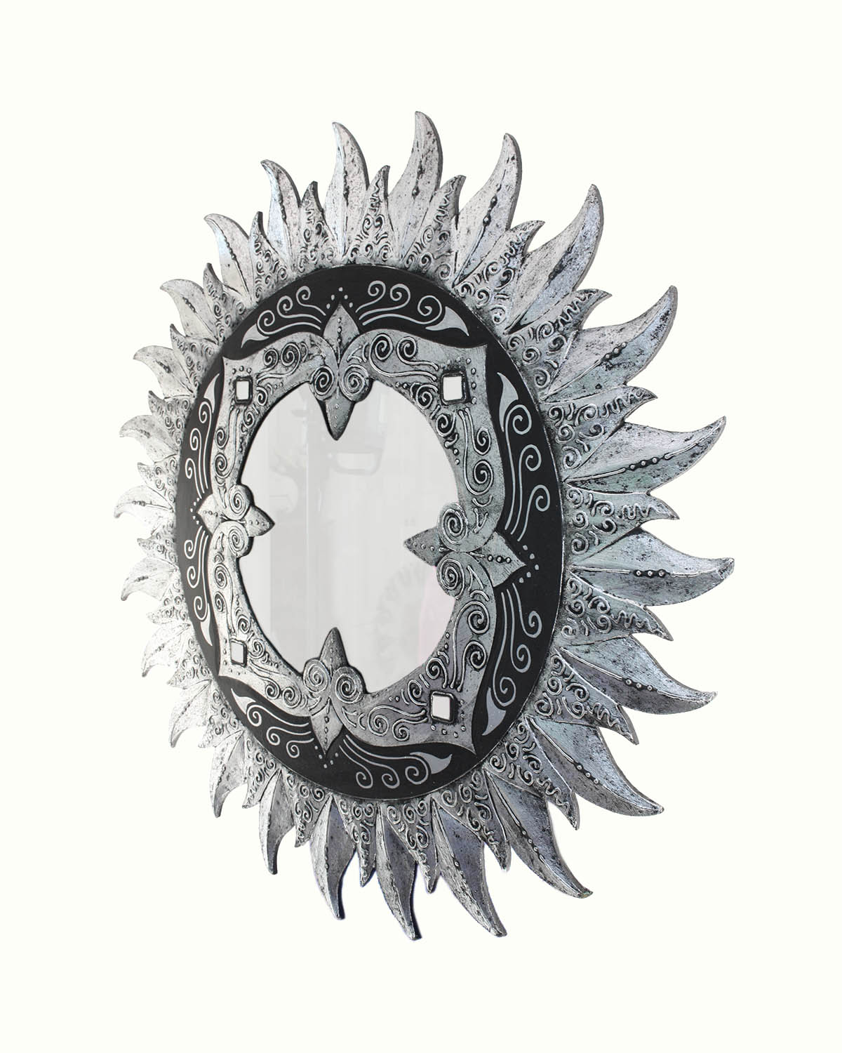 Originali e luminosi specchi a forma di sole con raggi realizzati in legno esotico intagliati e dipinti a mano da artigiani indonesiani, con tecniche artigianali. Intagliati a mano vengonopoi decorati con motivi orientaleggianti a rilievo, impreziositi da specchietti e dipinti a mano con pazienza, donanndo all’ oro e all’ argento un effetto antichizzato. Specchi particolari si adattano ad ogni ambiente, sia moderno che etnico, donando un tocco di luce…orientaleggiante. Disponibili color oro o argento con particolari neri. Dotati di attaccaglia. Misure: diametro cm 80, spessore mm 5.