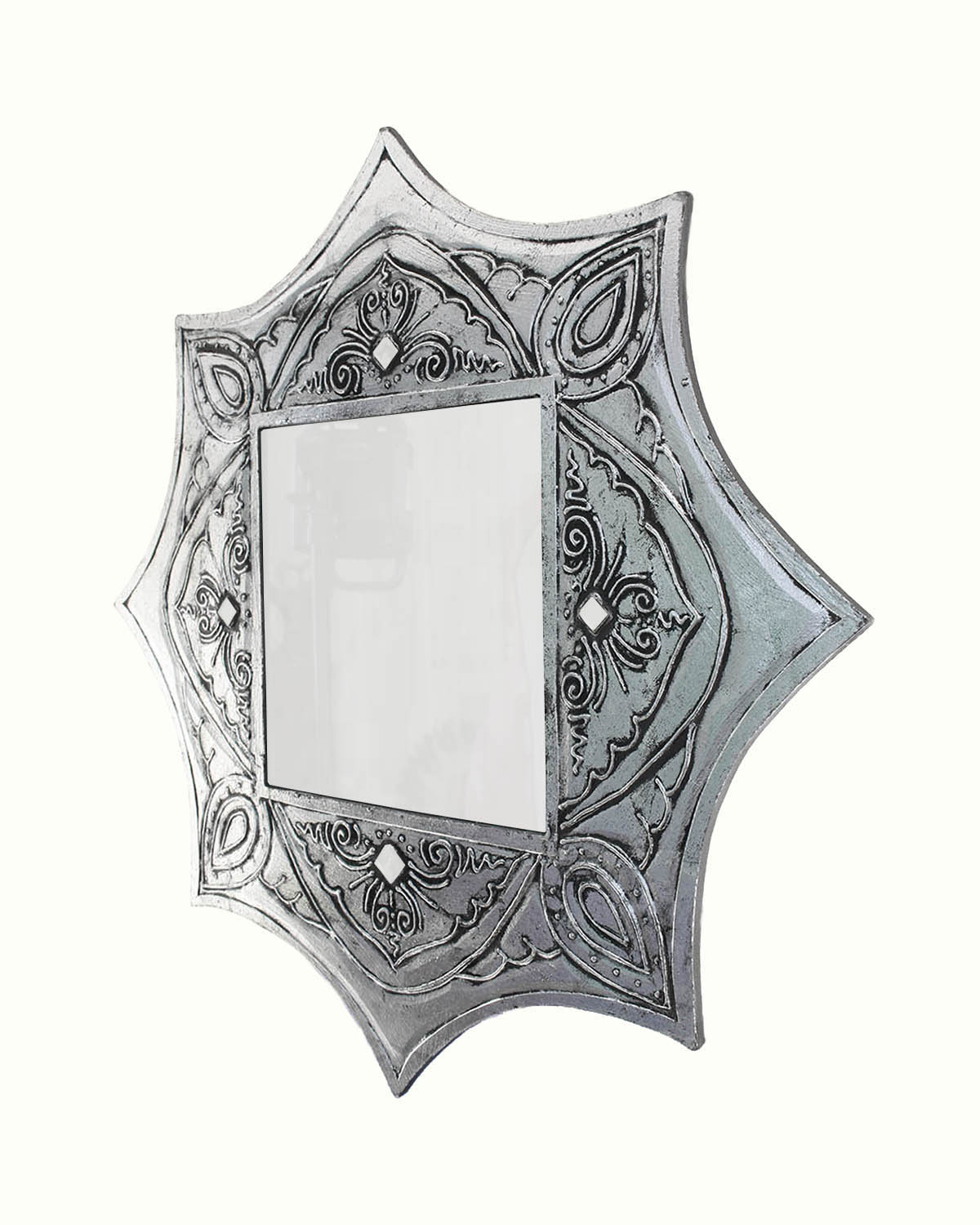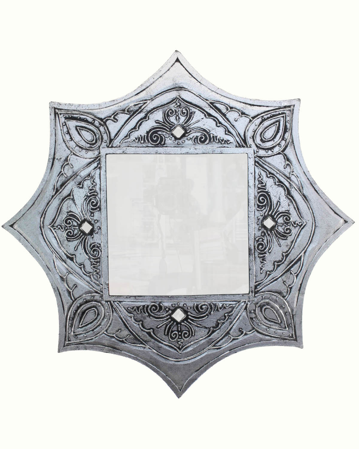 Originali ed eleganti specchi dalla forma ottagonale con decori in rilievo e specchietti, realizzati in legno esotico, intagliati e dipinti a mano da artigiani indonesiani. Graziosi specchi impreziositi da ghirigori a rilievo, si adattano ad ogni ambiente, anche a quello più moderno, donando un tocco di luminosa eleganza. Disponibili color oro o argento. Misure: diametro cm 60, spessore mm 3.