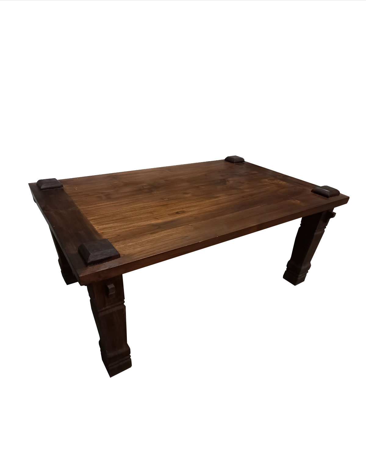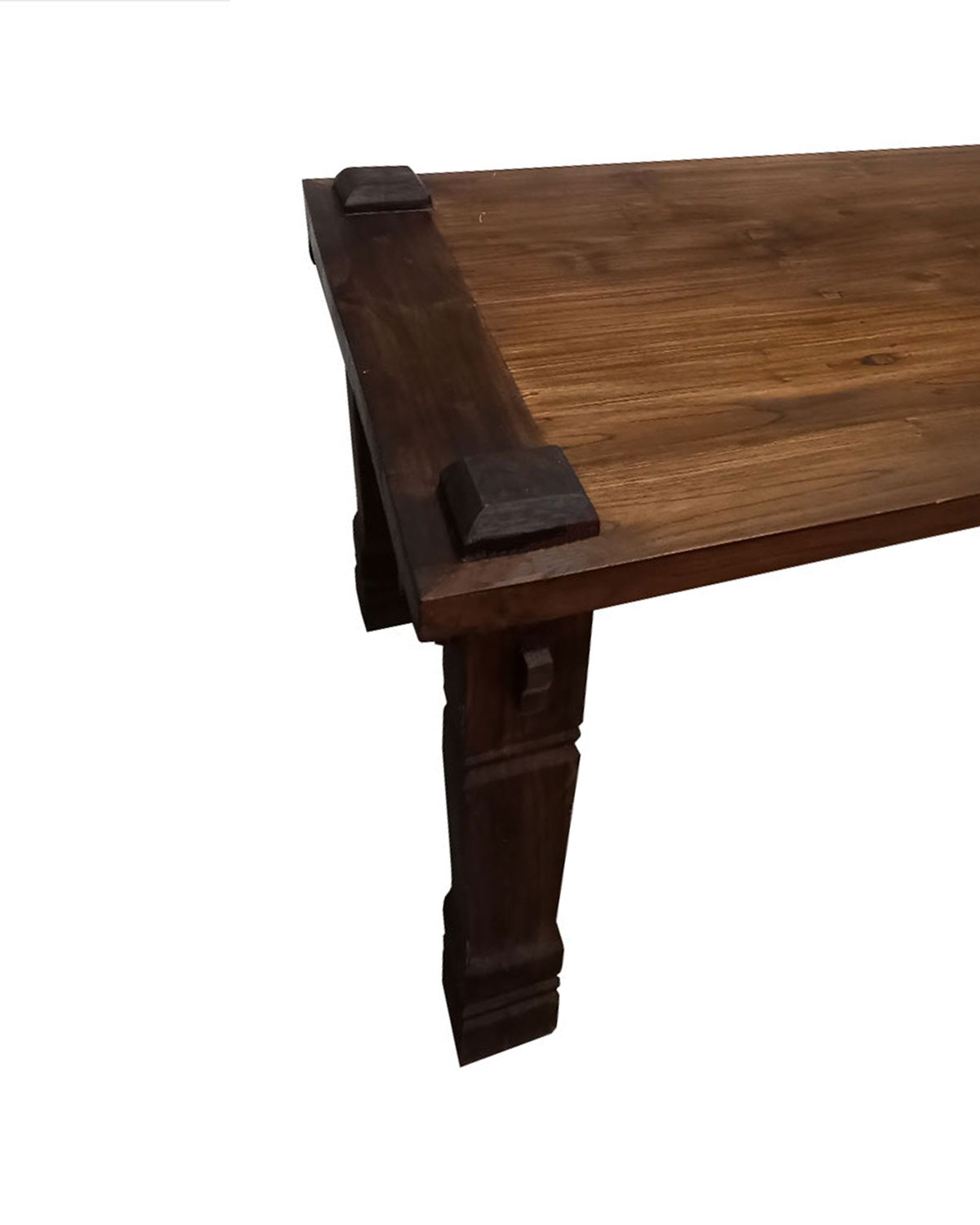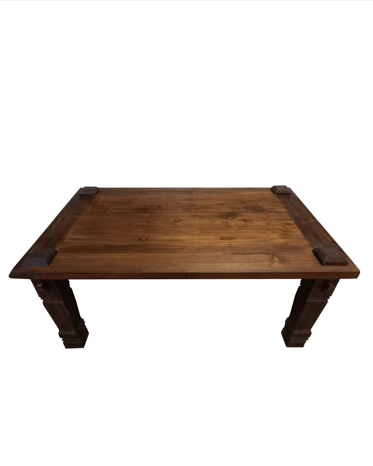 Bellissimo tavolino basso stile arte povera realizzato con tecniche artigianali da falegnami indonesiani in legno di teak massello. Dotato di robustissimo piano con quattro borchie sugli angoli e gambe sagomate molto robuste e importanti, piuttosto pesante. Bello per arredare una sala, un centro yoga , un centro olistico o anche uno studio o sala d’ aspetto. Disponibili color noce scuro. Misure: lunghezza cm 110 x larghezza cm 70, altezza cm 45.
