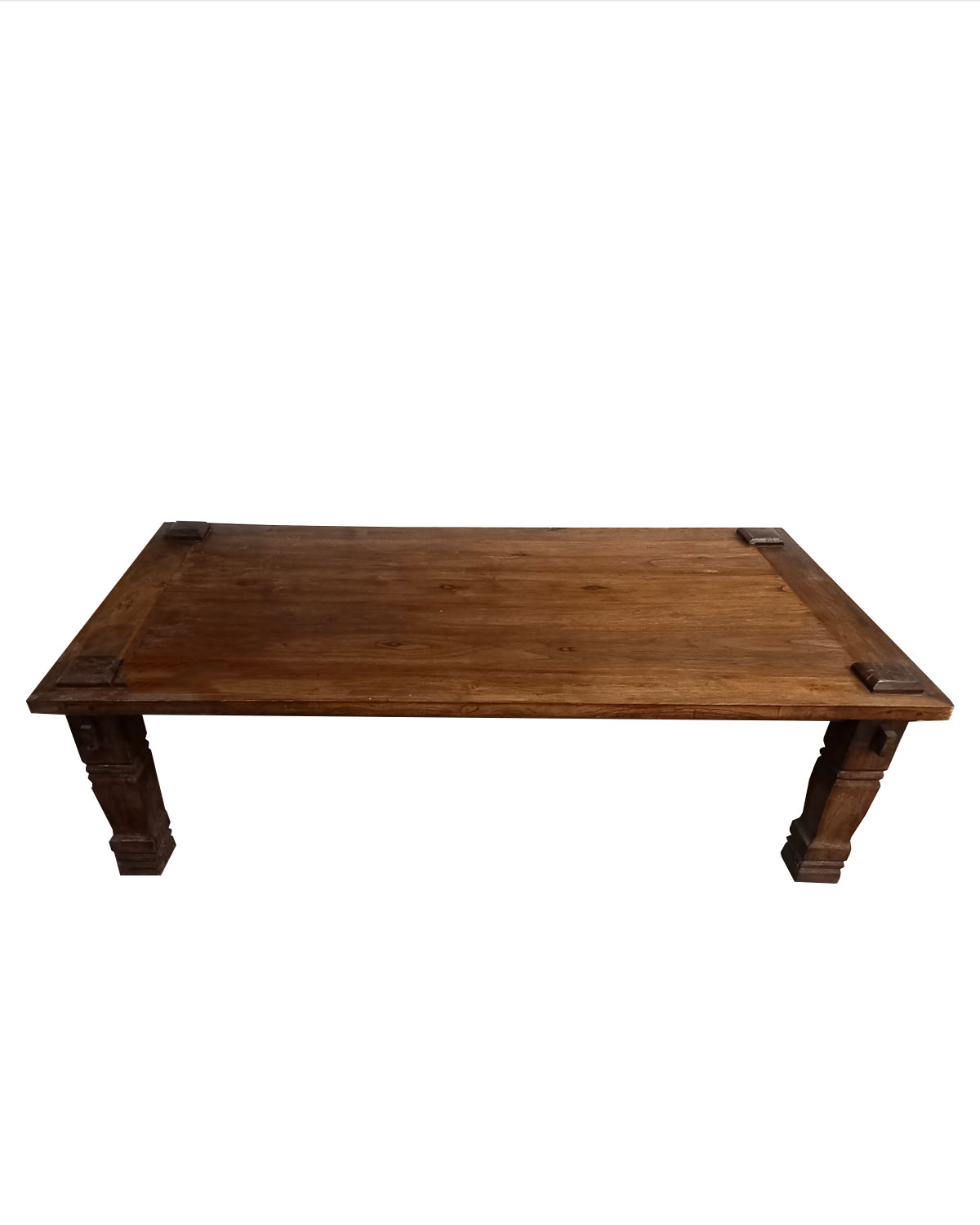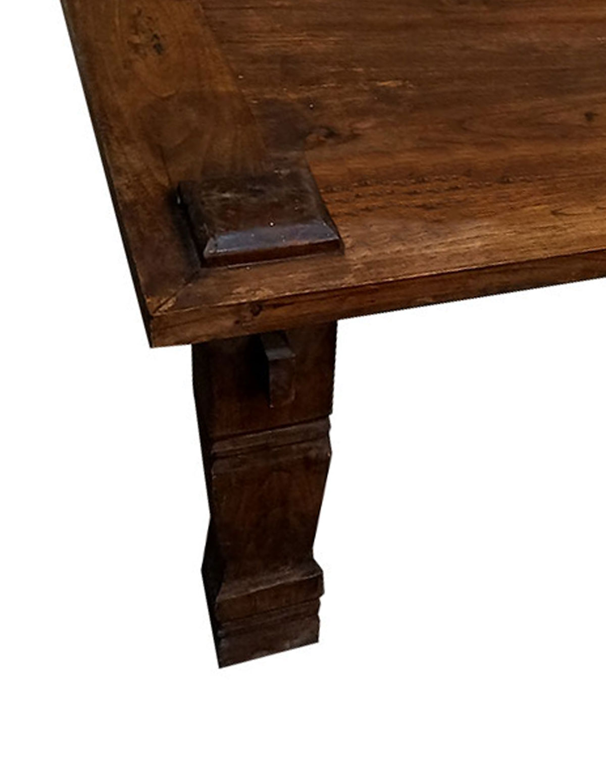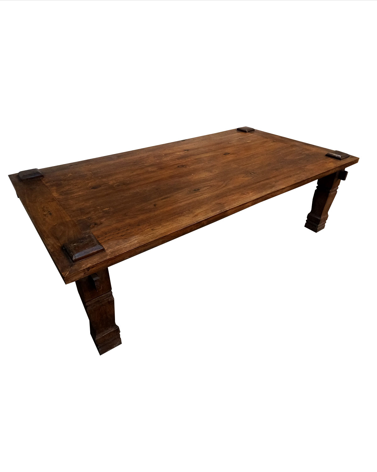 Bellissimo tavolino basso stile arte povera realizzato con tecniche artigianali da falegnami indonesiani in legno di teak massello. Dotato di robustissimo piano con quattro borchie sugli angoli e gambe sagomate molto robuste e importanti, piuttosto pesante. Bello per arredare una sala, un centro yoga , un centro olistico o anche uno studio o sala d’ aspetto. Disponibili color noce scuro. Misure: lunghezza cm 150 x larghezza cm 80, altezza cm 45.
