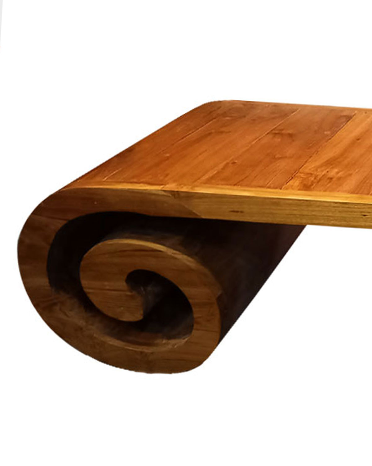 Originali tavoli bassi realizzati da falegnami indonesiani in legno di teak massello, con tecniche artigianali. Dalla particolare forma a spirale sono molto robusti e stabili, data anche la loro altezza ridotta. Belli da sala, ma anche per centri olistici o per mangiare seduti a terra. Disponibili color teak chiaro. Misure: larghezza cm 140, profondità cm 50, altezza cm 34, chilogrammi 26 circa..