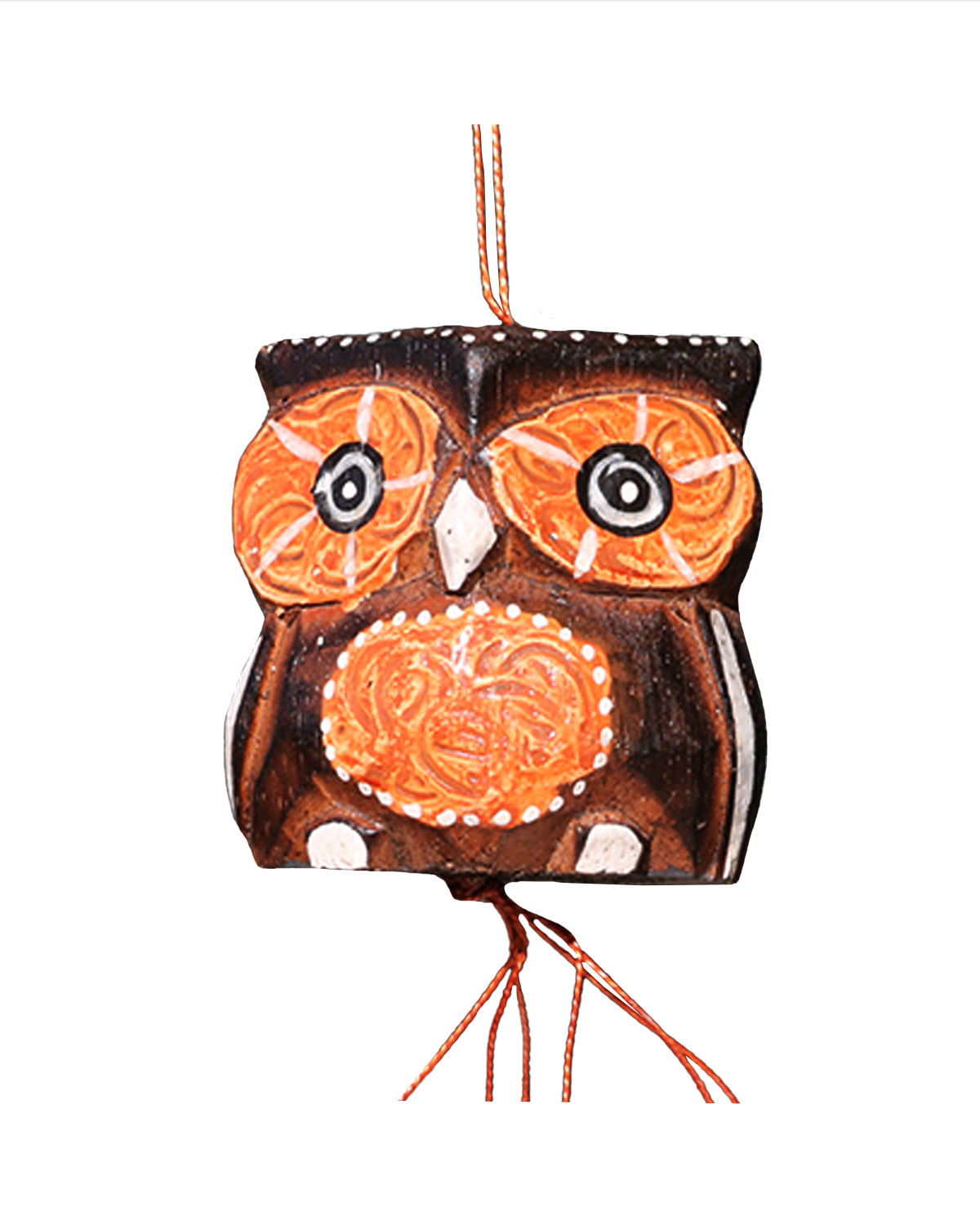Originali campane del vento realizzate artigianalmente con legno esotico e alluminio in Indonesia. Create con 2 dischetti e una pallina in legno , intagliate e dipinte a mano, con 5 sonagli in alluminio di differenti lunghezze sono curate nei minimi particolari. Dal suono dolce e delicato sono ideali da appendere in casa in prossimita’ di porte o finestre, ma anche all’ esterno sotto portici o volti, o comunque al riparo da pioggia battente. Disponibili con civetta marrone e decori a rilievo marrone chiaro e particolari color bianco. Misure: civetta cm 6 x 4,5 x h cm 6, diametro cerchietto cm 7, lunghezza totale cm 65 dalla civetta, esclusi fili d’aggancio., lunghezza canne in alluminio da cm 13,5 a 19,5.